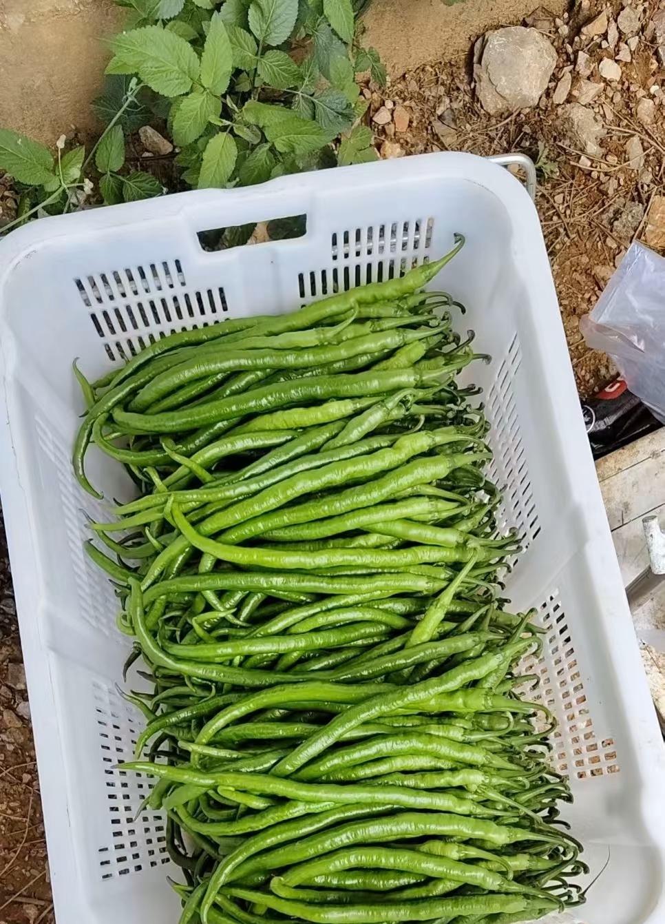 看看这一筐子线椒,绿油油的长得多精神!一根根细长细长的,跟小绿蛇似的,看着就新鲜。这要是回家剁吧剁吧,炒个肉、拌个菜,那不得香迷糊了!在地里现摘的就是不一样,带着泥土气,吃起来肯定脆辣爽口,就好这口原生态的味儿,绝绝子!