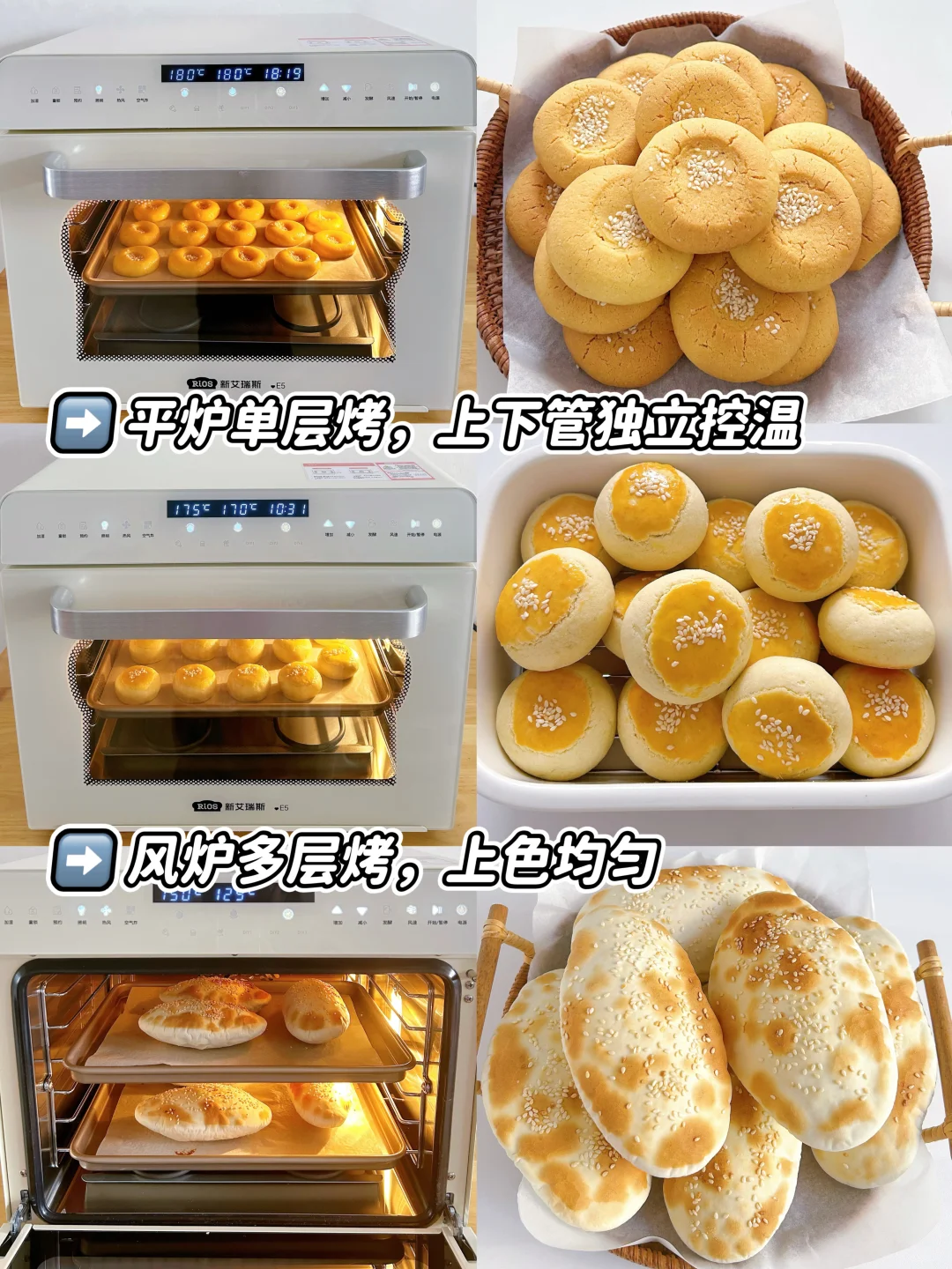 总的来说,千元家用烤箱中E5实力真的很出众❗一台顶四台,节省3倍空间,上色稳,控温稳,出品稳,小白也能轻松烤出大师烘焙,烘焙搭子首选它不出错~