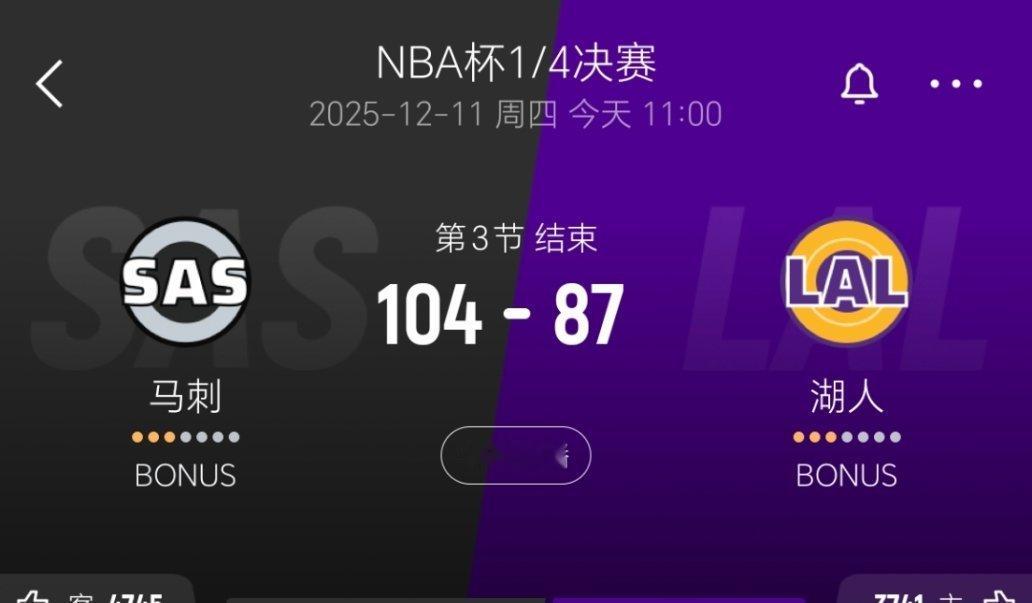 第三节结束,马刺104-87湖人!!!马刺vs湖人nba杯赛