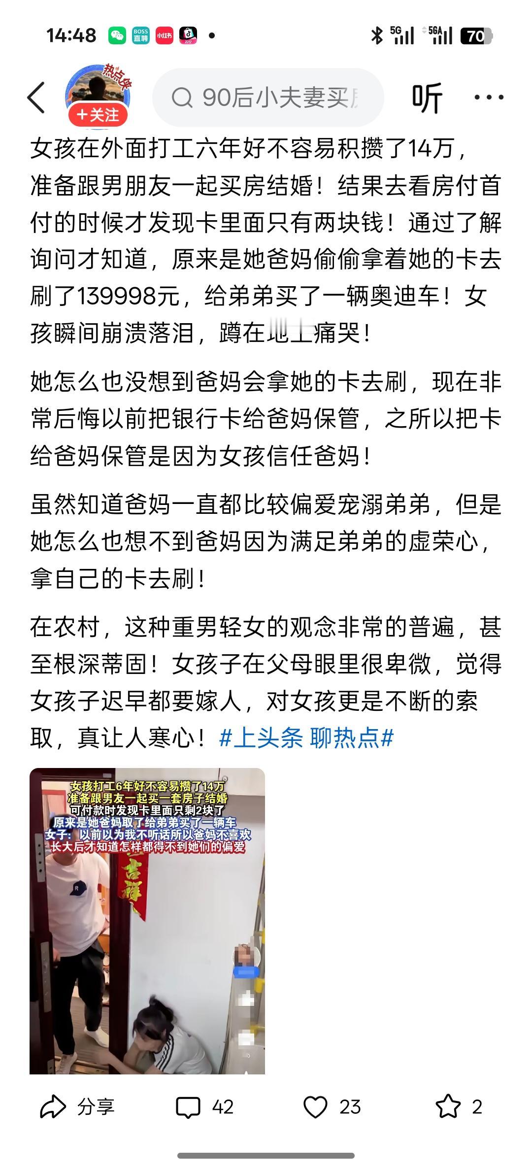 “中国父母都是重男轻女,长女该帮衬家里”,这什么歪理?我身边就有个朋友,她辛苦攒的钱,父母一声不吭全拿走给弟弟买房。这哪是一家人,分明是把她当提款机。 从法律上讲,父母对子女应平等对待,可重男轻女的父母哪管这些。遇到这种情况,得先和父母坦诚沟通,表达自己的感受。要是沟通没用,就得考虑寻求外部帮助。 作为女儿,别被“血缘绑架”和“道德枷锁”困住,要明白自己是独立个体,没义务为弟弟的人生兜底,坚决不做扶弟魔。
