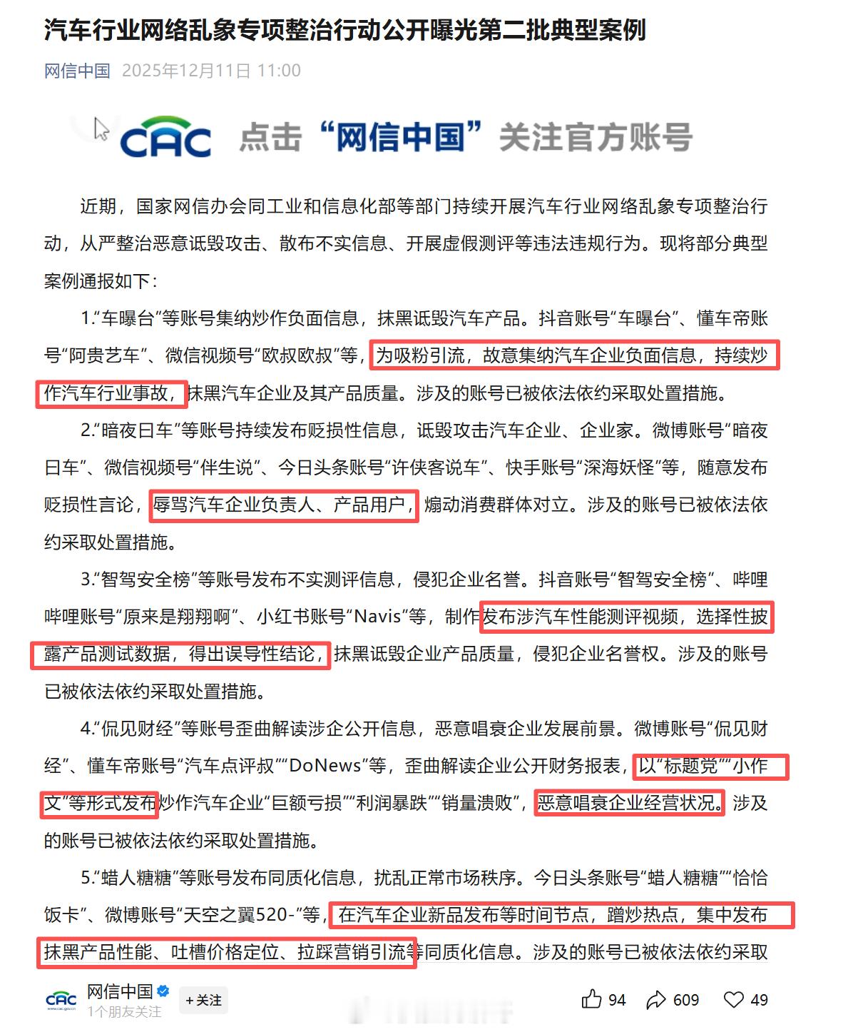 一批恶意抹黑汽车企业账号被处置 最近车圈又迎来一波网络大扫除,动真格重点盯上那些造谣、抹黑、乱带节奏的账号。这次直接点名通报了几类典型案例,看完真的只能说一句:整治的没毛病。总结一下这批账号:有的是为了流量啥都敢说,专挑行业里的事故和负面新闻拼命炒作,不管真假先发了再说,反正只要流量。要么是攻击型选手,他们不黑产品,张口就骂车企和企业负责人,甚至煽动车圈粉,故意引战,给车企搅浑水。还有一种假测评,表面上是在做汽车测评,实际上只挑对自己有利的数据发布,故意导向负面,让消费者做出错误判断。包括那种标题党和故意在汽车新品的发布会,比如把企业财报断章取义,动不动就喊“巨亏”“暴跌”“崩盘”,仿佛全行业都要完蛋一样,在集中发布抹黑产品、吐槽价格。大v聊车