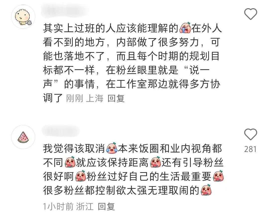 吴宣仪训粉又上热搜了,被批做爱豆既要又要情商低。 吴宣仪昨天发微.博说是不是应该保持一点距离,并在评论区说要取消行程图。有网友说这是在训粉,也有粉丝解释说是因为私生问题,之前私生跟到了直播间,打扰了艺人的正常工作。 感觉吴宣仪就是在正常表达自己的想法和情绪,她公开的线下对粉丝都超级好,被偶遇的时候也从来没有冷冰冰。 取消就取消吧,现在行程图发的太详细了,真的很容易被截.胡,而且吴宣仪本来就没有大经纪人,任何活动都会提前说的,行程图也没有任何意义,也少了些乱编排。通过一些方式,让明星与粉丝的关系更良.性.化,而不是一味的纵容,挺勇敢的。