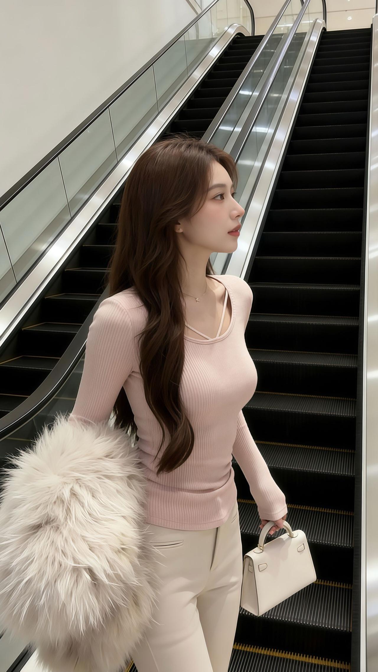 电梯里的优雅穿搭,粉色毛衣+米色裤子,搭配毛茸茸的外套,温柔又时尚!👗👠💄