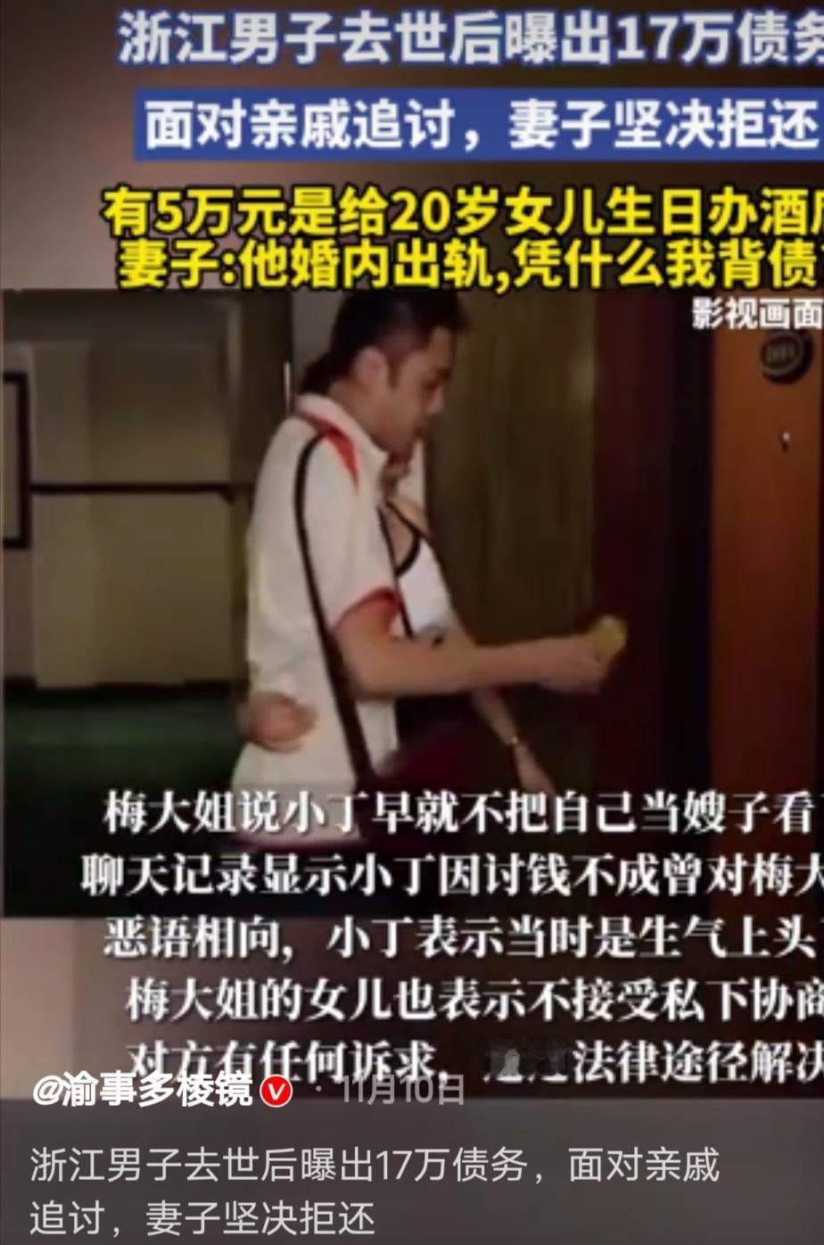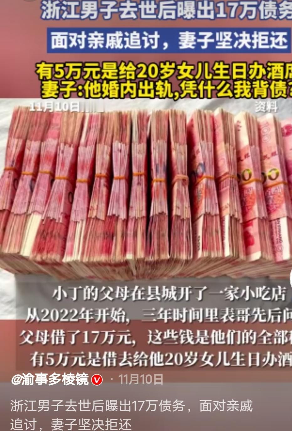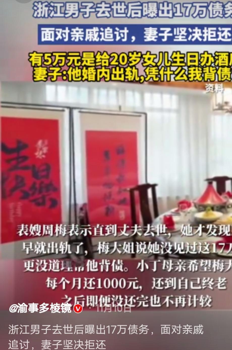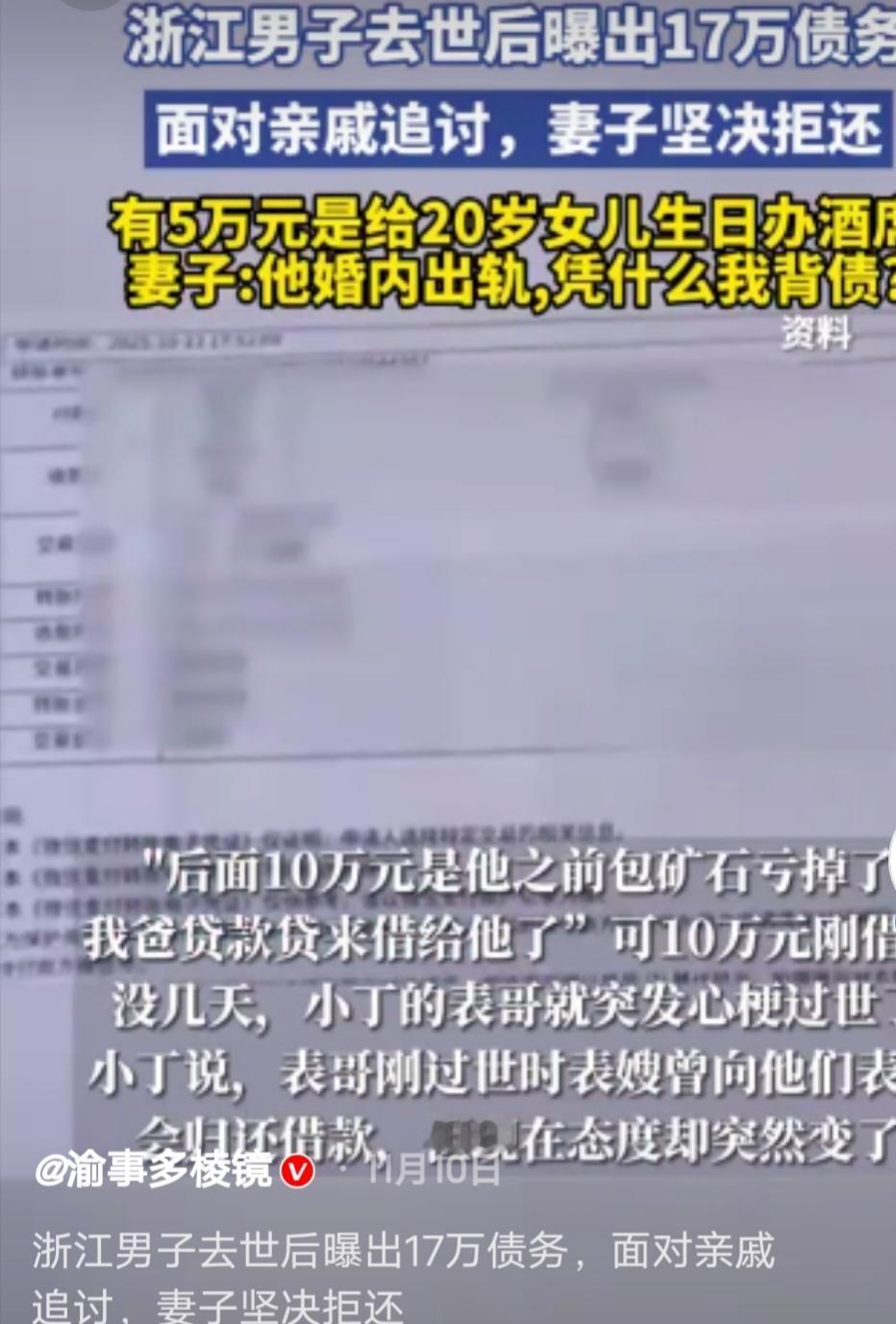 浙江男子离世留17万债务,妻子拒还引热议:出轨的债,不该我扛! 浙江这起纠纷