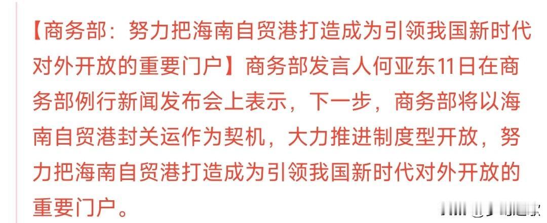 A股刚刚收盘,海南板块就来了利好,明天海南板块稳了 商务部:努力把海南自贸港打造成为引领我国新时代对外开放的重要门户。 现在海南板块几乎是一天一个政策性利好,对于海南的特色免税概念,像中国中免作为全球免税龙头,会因封关后免税额度、品类放宽,叠加客流增长进一步扩大市场份额,对于免税类公司来说是重大利好。 再一个就是对海南基建类是重大利好,要打造成新时代的门户,肯定就要建设,不管是老基建还是新基建都将会受益。 海南板块已经是A股有机会板块的独苗了,因为是政策市,现在别的利好都炒不起来,明天就看海南板块了。