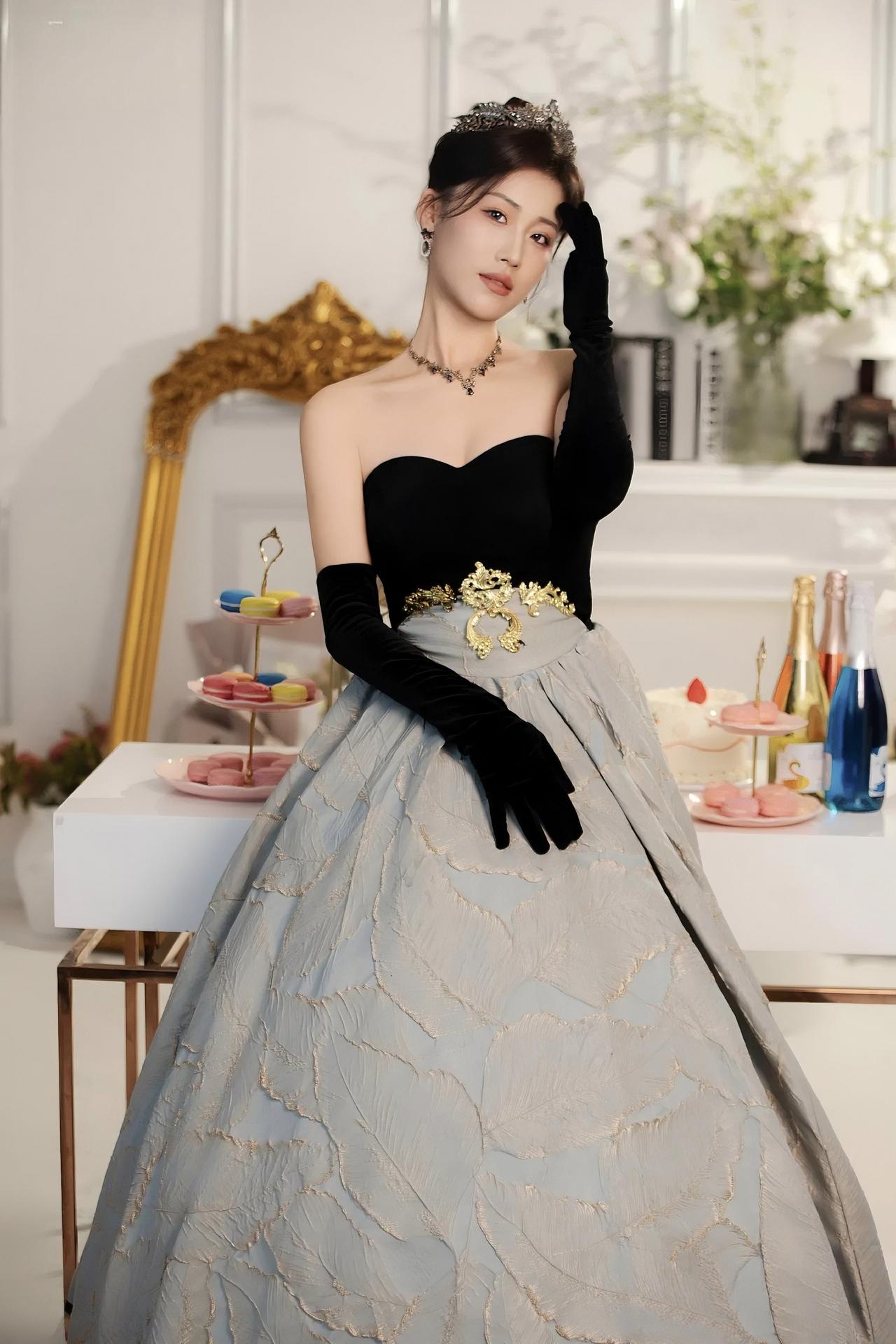 戴上皇冠的那一刻,感觉自己就是城堡里的公主👑 黑灰撞色的礼服太戳我了,丝绒抹胸的精致感拉满,裙摆的纹理像揉碎的月光,搭配黑金腰饰瞬间贵气起来。甜品台的蛋糕、马卡龙和香槟,把法式下午茶的浪漫氛围拉满~ 在属于自己的仪式感里,永远做热烈又闪耀的自己,这种被美好包围的感觉,真的太幸福啦💫粉珊瑚礼服裙 轻奢洋气礼服 梦幻紫玫瑰礼服