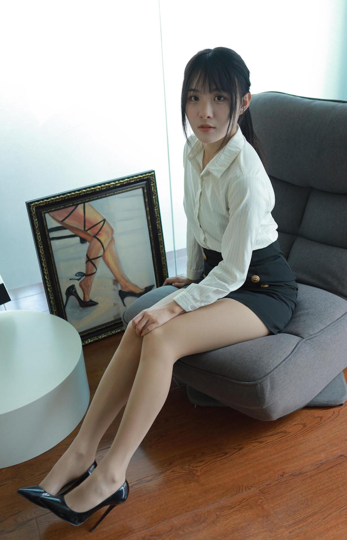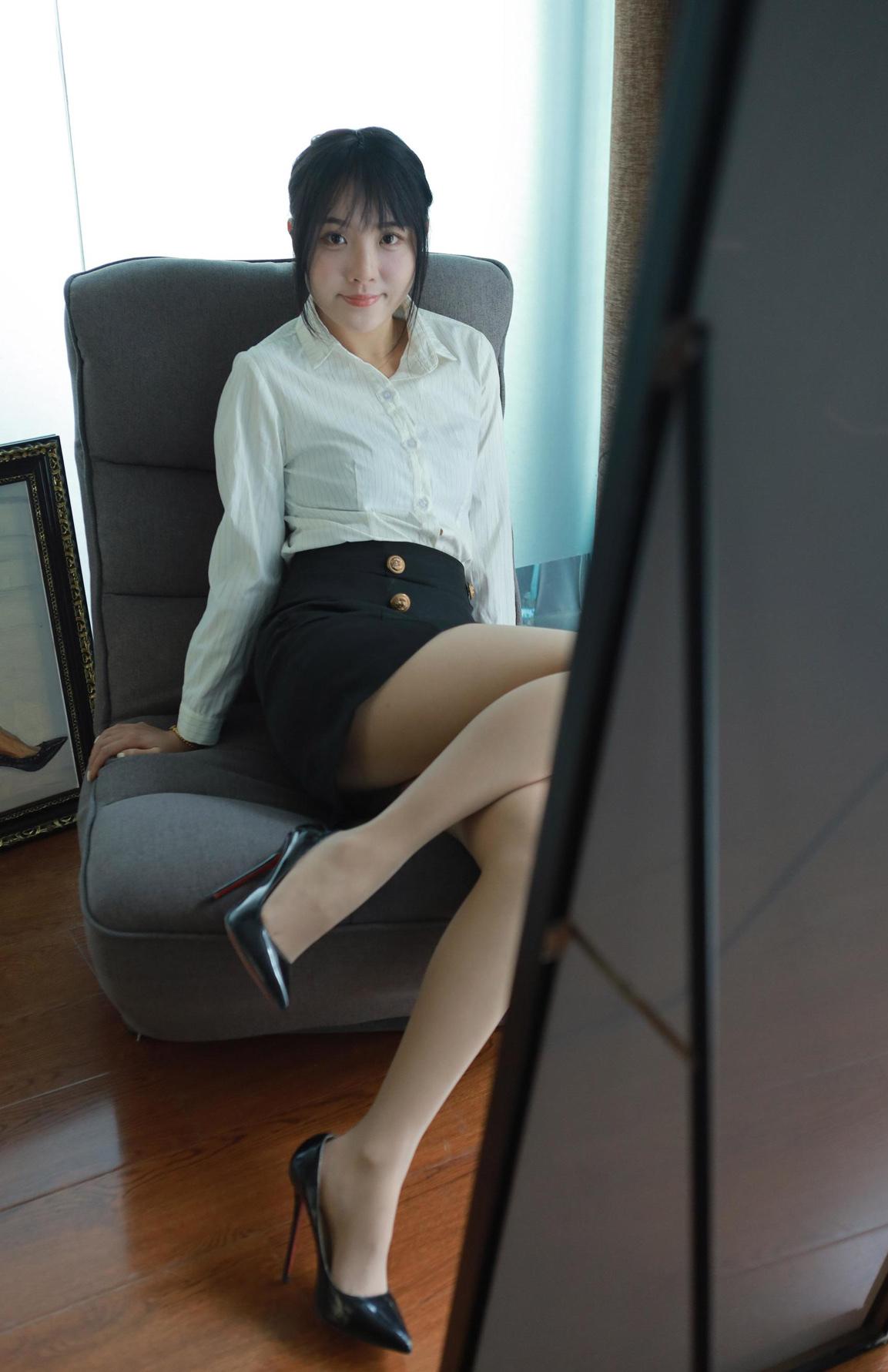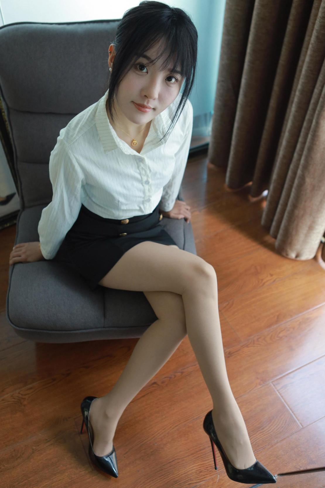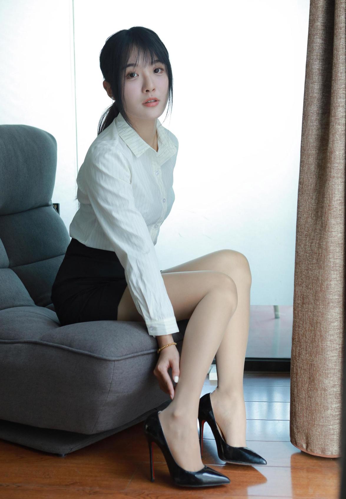 一个姑娘在办公室试高跟鞋。高跟鞋女 上班日常高跟鞋 职业高跟鞋女款 女生的一条丝