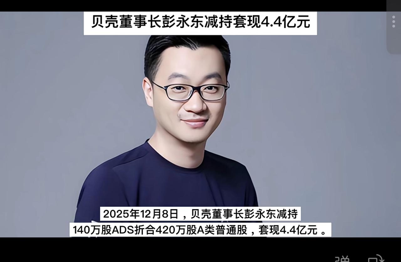 贝壳董事长彭永东首次减持4.4亿股票,全部用于公益捐赠 2025年12月8日,贝壳找房董事长彭永东完成上市以来首次股票减持,套现约4.4亿元,全部用于兑现此前公益捐赠承诺。此次减持140万股ADS,相当于420万股A类普通股,资金将用于居住行业服务者医疗健康福利及应届毕业生租房帮扶。 值得注意的是,这是彭永东自2020年贝壳美股上市以来首次出售股票。贝壳方面表示,捐赠资金将通过格林互助和贝壳公益基金会联合第三方公益机构执行落地。其中,50%税后资金将用于居住行业服务者及其家庭成员的医疗健康福利,50%用于应届毕业生等群体的租房帮扶。 市场反应方面,贝壳港股在消息公布后一度下跌超5%,但随后获得支撑反弹,截至12月11日收盘报44.44港元,录得2连升。美股盘前也涨超3%。
