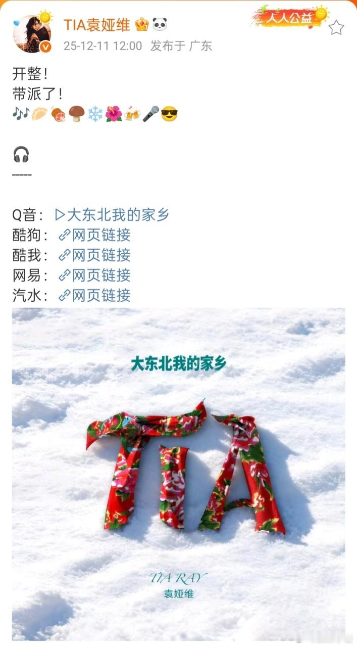 袁娅维官推版大东北热辣上线 全网期待的唱大东北来了!官推版《大东北我的家乡》正式上线,Tia不愧是宠粉天后,永远把粉丝的愿望放在心上,你有这么有实力还宠粉的宝藏歌手~已经迫不及待听Tia在演唱会现场唱了!