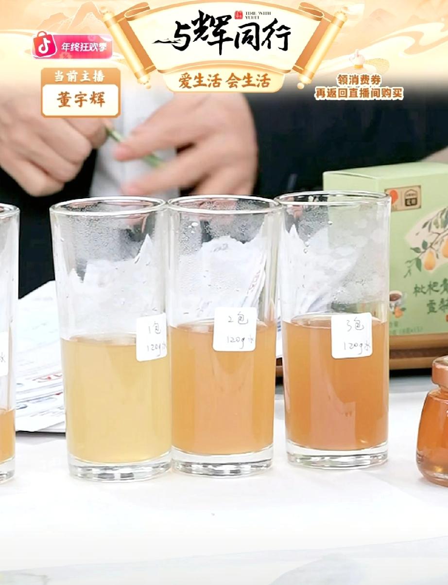 与辉同行定制枇杷青果雪梨膏来啦!董宇辉今天一上播便带来了定制产品。他讲品喜欢用比较的方法,让大家一目了然。 他通过一包雪梨膏加上三种不同克重的水和同样120g的水分别加1包、2包,3包雪梨膏的方式共冲出6杯,让大家进行比较。 与会同行的定制品永远都不够卖,有朋友可能进来的比较早,说抢了8单,有朋友抢了10单,真是幸运!不过总体来说这次的雪梨膏还可以,不像四件套和定制牛肉那样,手慢一点完全抢不到。 希望与辉同行推出更多的定制品,让大家买到更多高品质又价格实惠的产品。 董宇辉 与辉同行