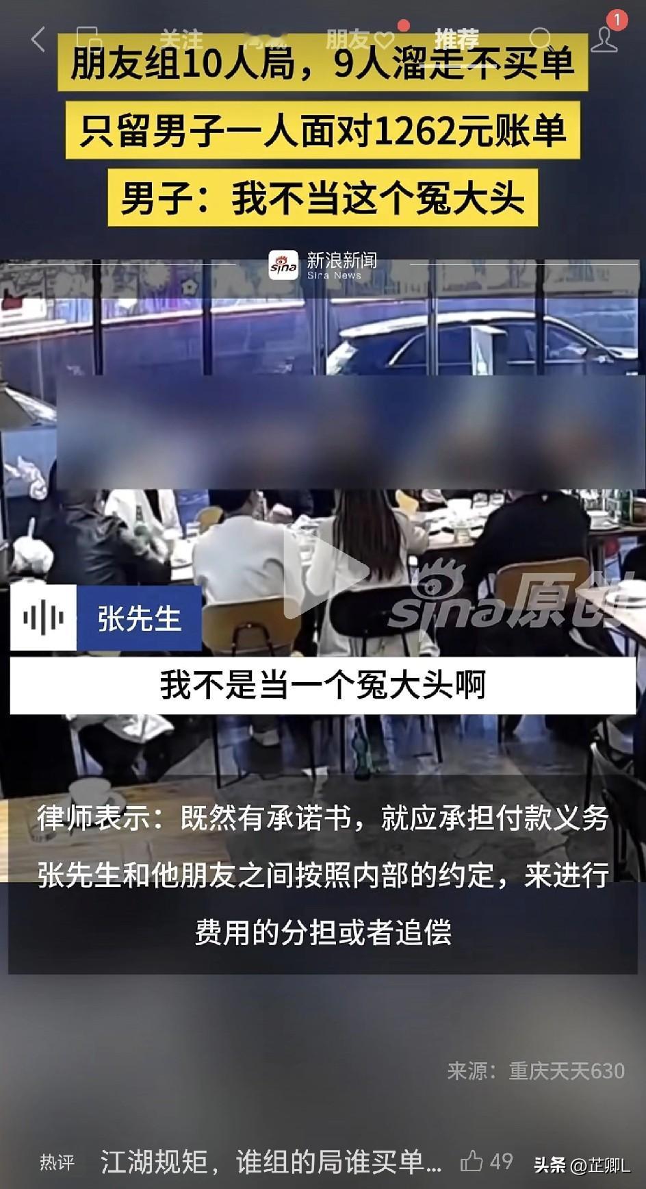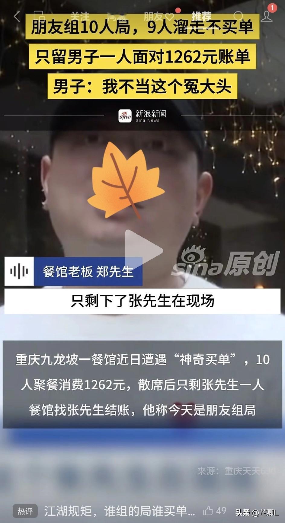10人聚餐吃到深夜全溜光,只剩1人对着1262元账单傻眼:我不是冤大头!1262元试出“塑料兄弟情”! 重庆一家餐馆老板最近遇上一桩“奇案”:10个人热热闹闹来聚餐,从傍晚吃到深夜12点,结果散场时——桌上只剩一个人! 据餐馆老板郑先生描述,这桌客人消费了1262元,酒足饭饱后,其他9个人不知什么时候全溜了,唯独剩下张先生一人。 老板自然找这位最后的“独苗”结账。没想到张先生两手一摊:“我现在没钱啊!” 他解释道,这顿饭是朋友组的局,按理该组局的朋友付钱,可现在怎么也联系不上那位朋友了。“等明天联系上了,我一定把钱转过来。” 餐馆老板无奈报警。民警电话联系了那位传说中的“组局朋友”,对方一句“我也没钱,得筹钱”,直接把皮球踢了回来。 最后在民警协调下,张先生写下承诺书,押了身份证,答应第二天18点前一定结账。 你以为这就结束了?没想到,第二天张先生反悔了! 理由很“充分”:“我朋友没把钱转给我啊!”面对记者采访,他直言:“我的确承诺了,但你说我把这个钱付了,从某个程度上我是不是冤大头啊?” 那,这钱到底该谁付? 餐馆老板至今没收到钱,也联系不上张先生那位“神秘朋友”。这1262元到底该谁掏? 有律师表示:既然写了承诺书,张先生就该履行付款义务。至于他和朋友之间谁该出这个钱,那是他们内部的事,可以自行协商或追偿。如果餐馆仍收不到钱,完全可以走法律途径维权。 一顿普通的聚餐,吃出了人生百态。 事件曝光后,网友纷纷表示: “吃的时候是兄弟,买单时是路人!” “这朋友交得‘值’,一顿饭看清9个人!” “老板最冤:一桌菜喂了10个,最后逮住1个还是‘没钱’的!” “所以啊!不要啥饭局都参加,所谓的兄弟朋友友谊都是虚的。” “好兄弟,这就是讲义气的兄弟!” “钱,就是人性的试金石。” “AA制最好的了!” “侮辱了朋友这个词!” “交友需谨慎!” “没一个体面人!” “物以类聚,人以群分!” “真正的酒肉朋友!” “凡是说‘改天请你吃饭’的,八成没有改天。” “主动组局又不提怎么结账的,赶紧找借口溜。” “还是AA制最好,谁也不欠谁,吃完各自回家睡觉。” 重庆这1262元的“逃单剧”终会落幕,但它留下的思考还在继续:我们究竟需要什么样的社交? 是觥筹交错后的面面相觑,还是简单明了的心意相通? 是算计谁该买单的“塑料情”,还是互相体谅的真友谊? 下次赴约前,不妨多问一句:这顿饭,值得吗?这群人,靠谱吗? 毕竟,最好的“防坑指南”,不是学会怎么在饭局后半程溜走,而是从一开始就选择对的人,吃有意义的饭。 如果你遇到这种情况,你会怎么办? 是自认倒霉掏钱,还是坚决不当“冤大头”?评论区聊聊你的看法! 信息来源于新浪新闻,侵联删!