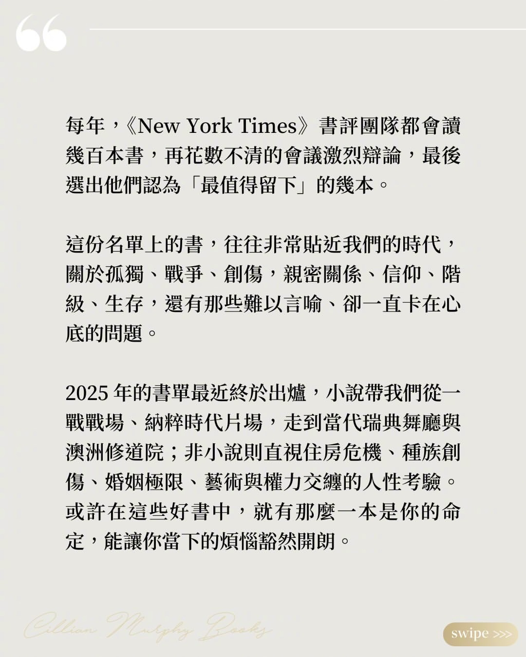 2025年必读书单——每年,《纽约时报》书评团队都会读几百本书,选出他们认为“最值得留下”的几本,2025 年的书单最近终于出炉了。这份名单上的书,非常贴近这个时代,主要是讲述关于孤独、战争、创伤,亲密关系,以及难以言喻、却一直卡在心底的问题。
