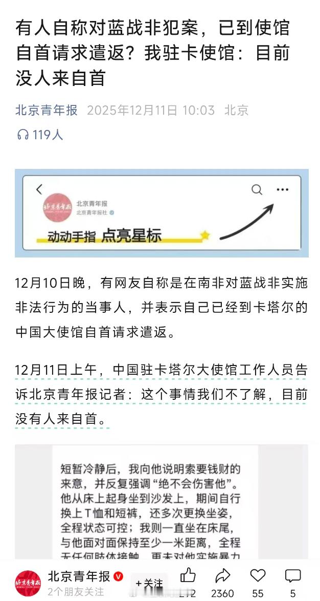 蓝战非被绑架这事越发离谱和抽象了,驻卡使馆工作人员刚刚回复了,没有人去自首…… 疑似绑架蓝战非的人自首
