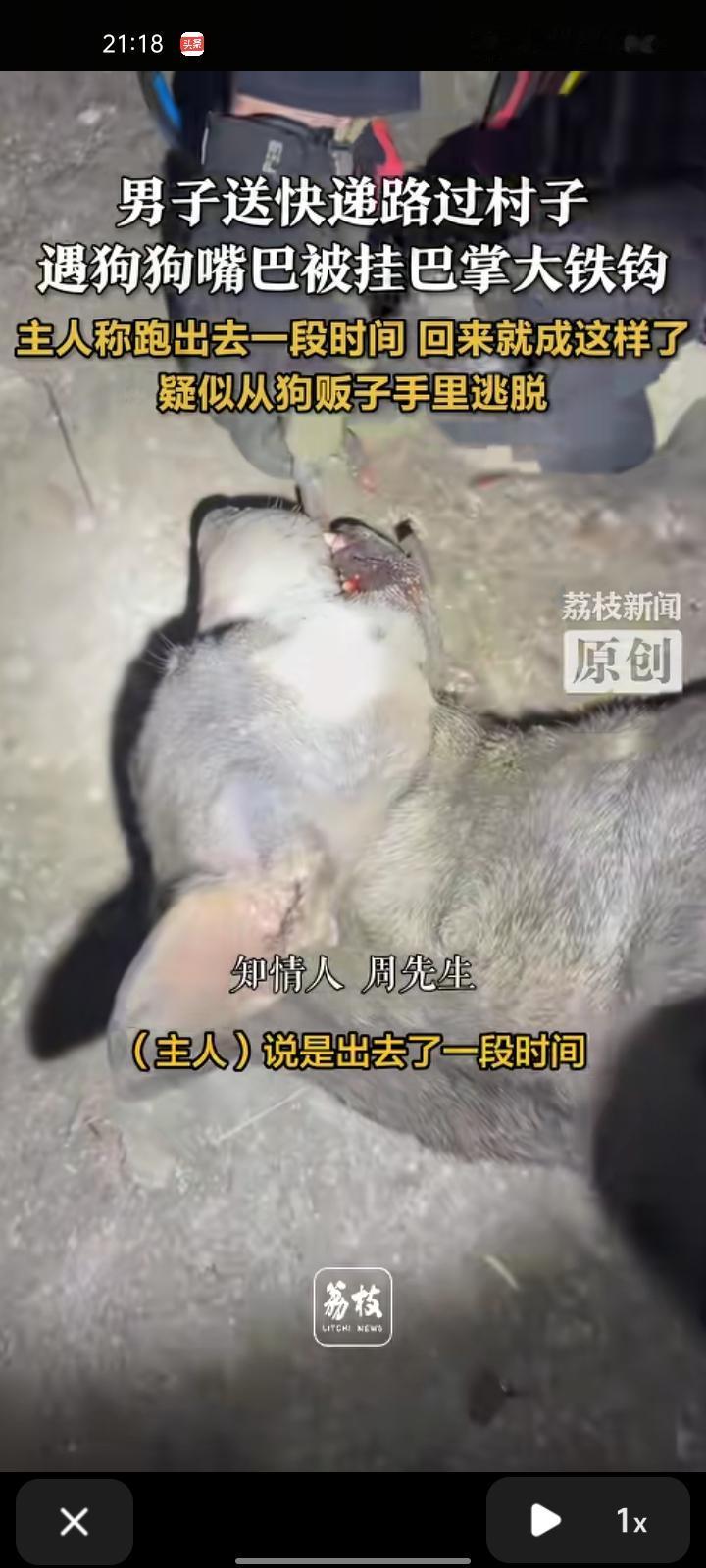 12月9日,绍兴诸暨市。网友晒视频称,自己送快递时遇到狗狗嘴巴上挂着大铁钩,起初以为是挂在脖子上的扣子。狗主人可能是怕它过激了,后来宠物医生给它催麻才把钩子取下来了。事后狗主人称是出去一段时间,回来就成这样了,疑似从狗贩子手里逃脱。