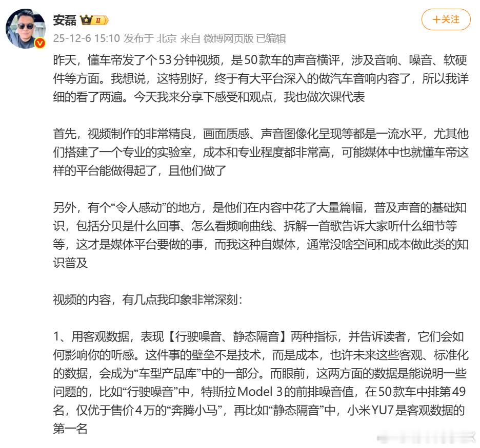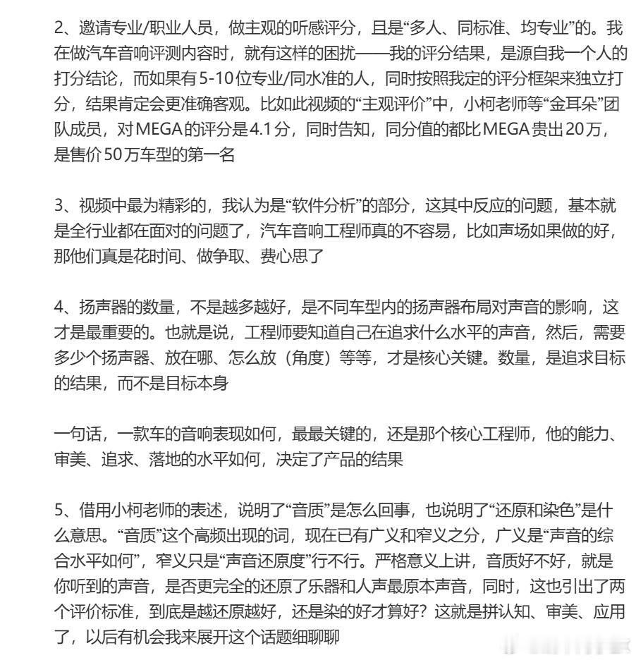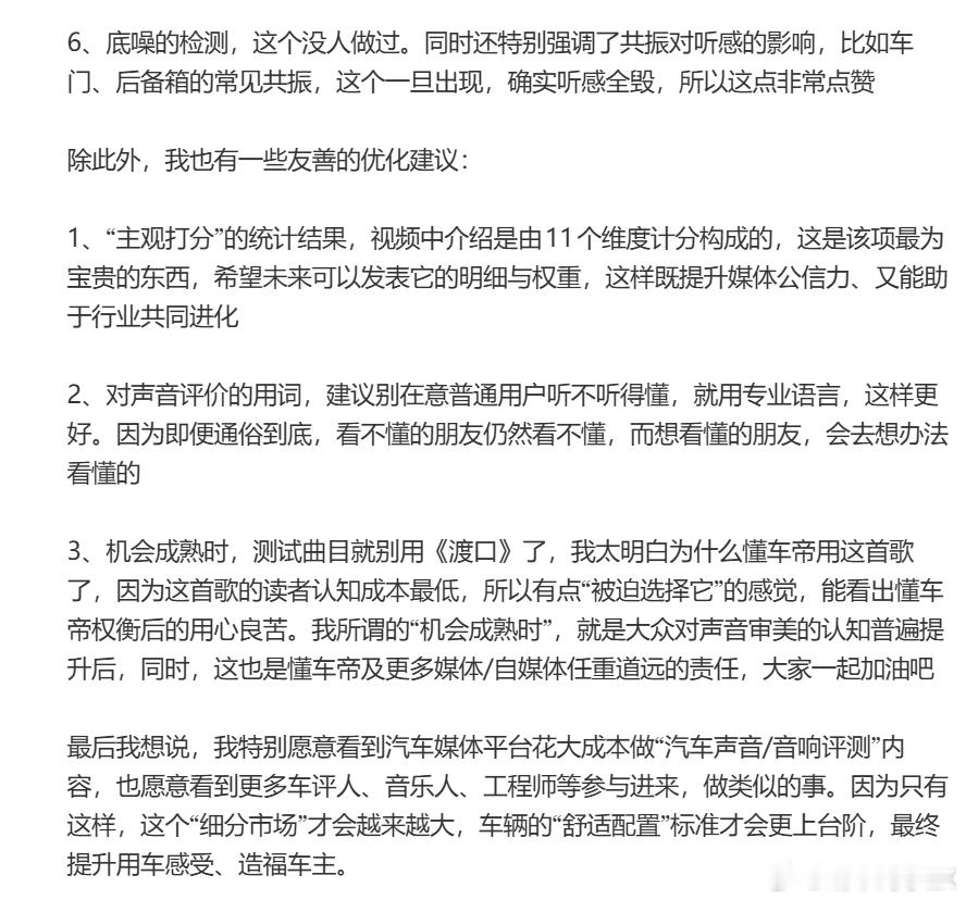 听声音就能判断一辆车值不值汽车音响音质好坏怎么看这次懂车帝的打分,虽然是参考了“主观”评价,但其实还好,借用音乐博主“安磊”的评价——11个维度来计分,很全面。如果下回能够再明确一下每个维度的明细和权重就更好了,既能提高公信力,也能给行业带来一些标准,促进共同进化。