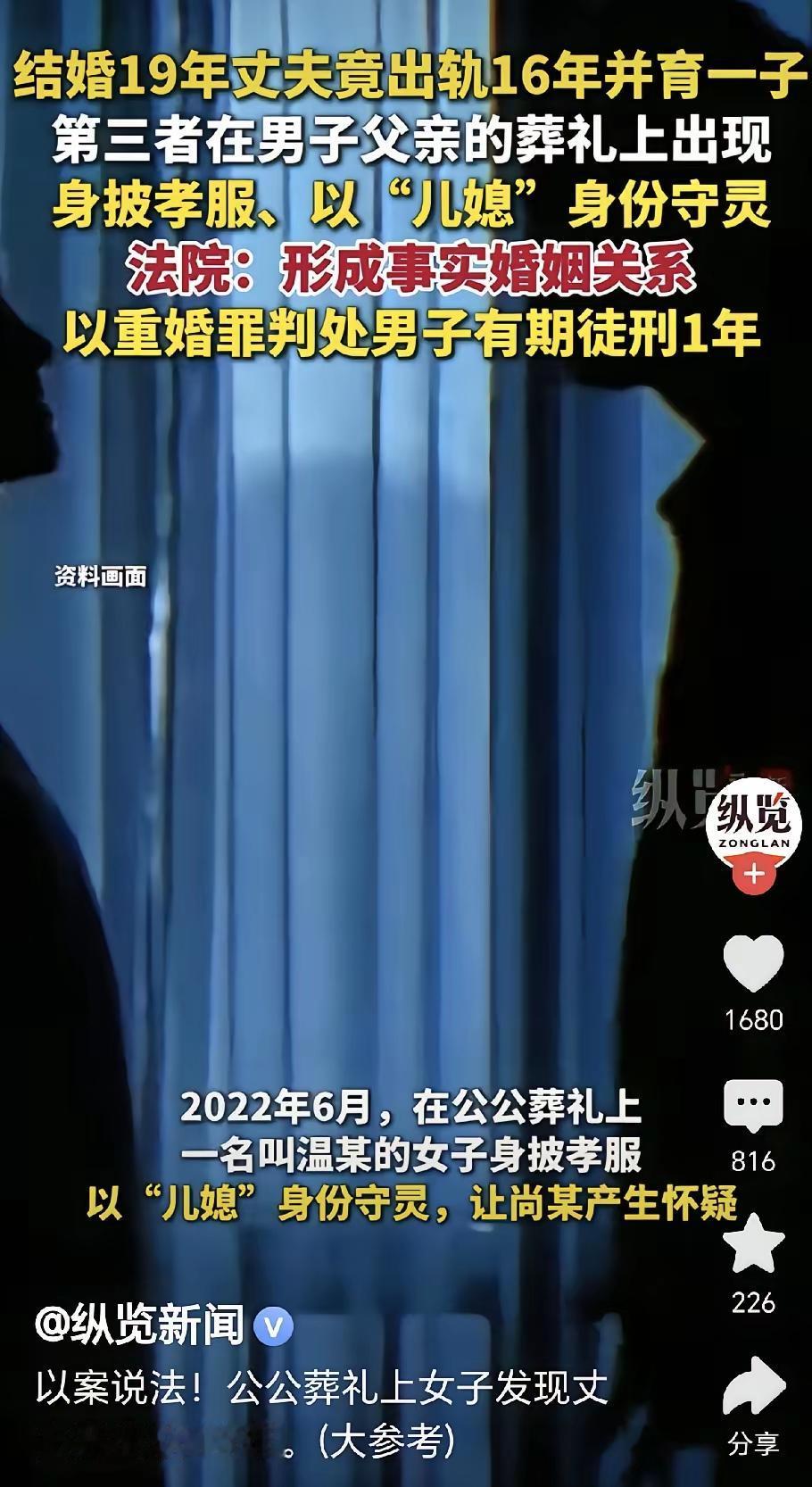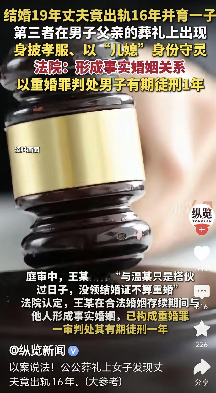电视剧都演不出来!山东临沂,公公去世,儿媳妇给公公料理后事,突然一陌生女子,公然以儿媳身份为公公守 灵!她一查才知,她和丈夫结婚19年,丈夫早就出軌,说他跑长途货运,需要长期离家在外,原来他是搬去和女子同住,还和女子生了个孩子,婚后19年时间,有16年都在和小三过日子,他们住在一起,对外称作夫妻,如今公公去世,女子大摇大摆前来守 灵,儿媳怒不可遏,一纸诉状告到法院,丈夫狡辩: 我和她只是搭伙过日子,并没有领结婚证…… 最终法院判决,王某犯重婚罪,判有期徒刑1年。 网友评论: 丈夫判了而小三呢?难道小三不知道人家有家庭?小三应该受到什么惩罚?按现行法律私生子也有继承权,小三不光没被惩罚还相应得到了保护。这就是现实社会中好吃懒做的人争做小三的原因。 重婚16年,最少判五年,然后净身出户,女的也应该最少三年,补偿原配精神损失费50万(破坏别人家庭16年)! 在一起生活,小孩也有了,都不算重婚罪,就因为没有那本证?唉!法律这是对出轨人,第三者,私生子有多拥护啊。