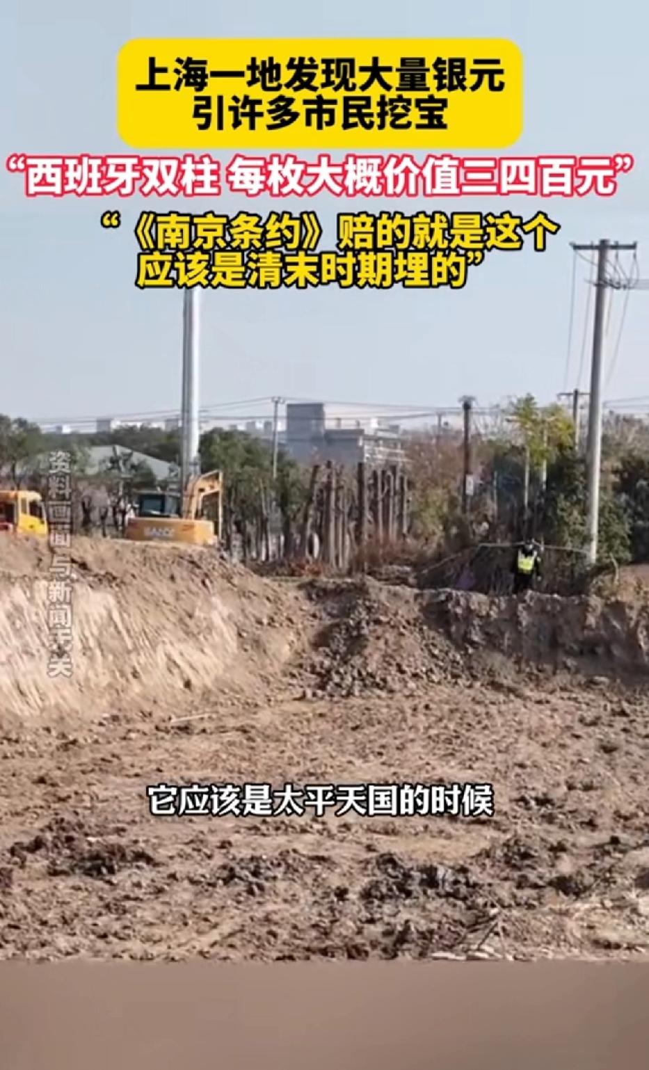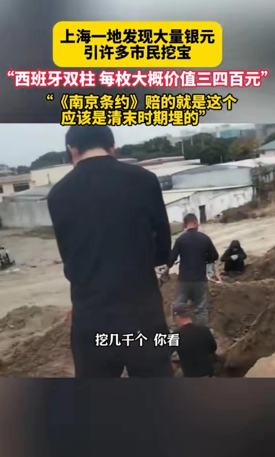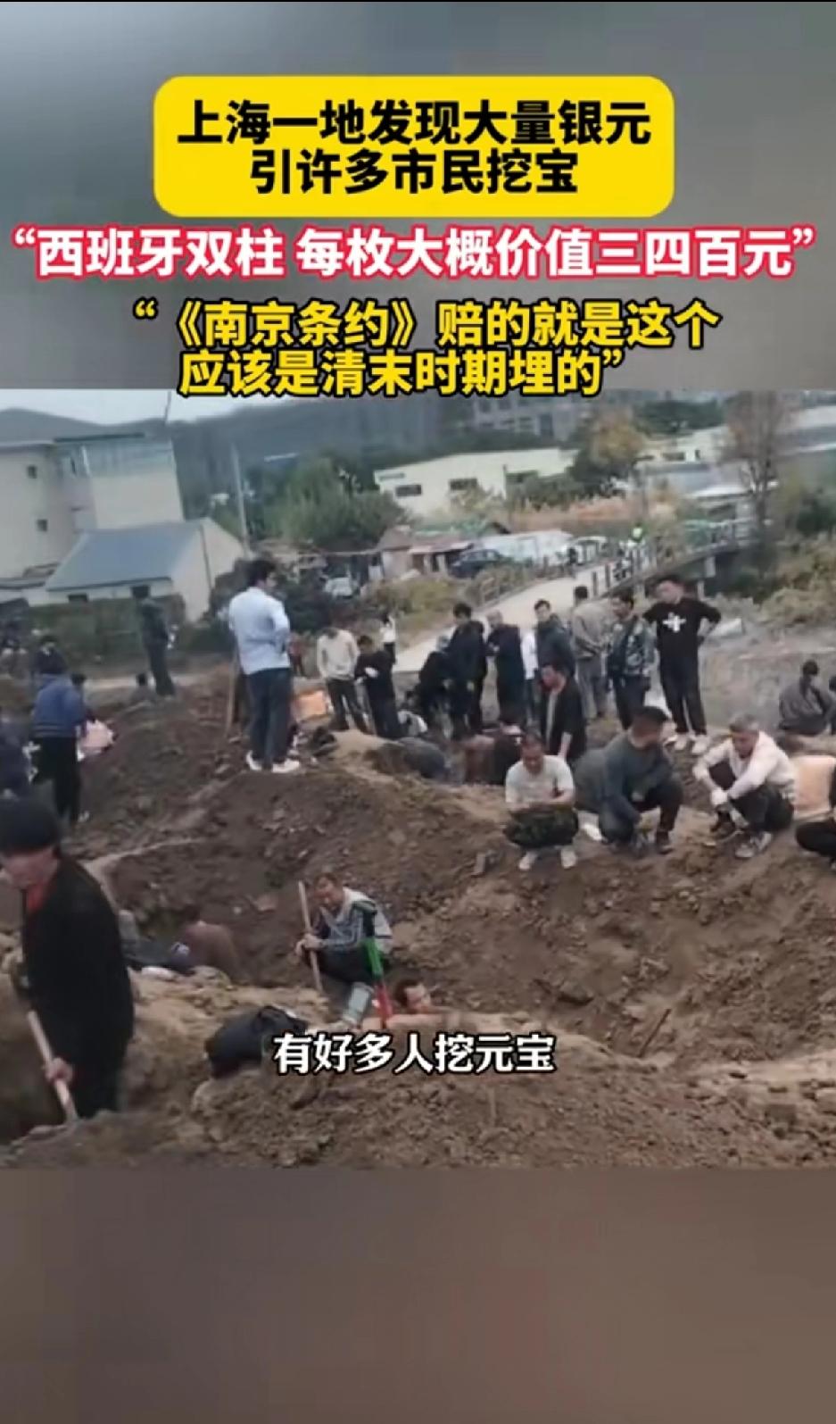 上海一地方发现大量银元,引来许多市民挖宝。 上海松江车墩镇一处施工工地可热闹了!有网友发视频称这里出土上千枚银元,一下吸引上百名周边市民带着铁锹、金属探测仪去挖洞寻宝。 视频里还喊着“发财了”,不过都没拍到银元出土。 天色晚了,很多人打灯光还在挖,警车都到了。 现场小土坡被挖出好多坑,属地民警拉了警戒线,可警戒线外还是有不少人围观。 据了解,这小土坡原是老宅,12月9日晚有人挖到银元后消息传开,昨晚聚集了上百人。 有目击者展示挖到的类似西班牙本洋的银元图片。 有在附近上班的古币收藏者说,挖出的是西班牙双柱银元,一枚大概300元,也不是特别值钱。 虽然不是特别值钱,但挖宝的感觉一定很美妙,尤其是这几年火爆的“听泉鉴宝,” 里面很多持宝人,拿着祖传的银元改善生活走上致富的道路。 这些挖宝的市民,拿着铁锹和探测仪,满怀期待的做着发财的美梦。 都希望自己挖到金元宝,或者挖到一枚绝世孤品,脱贫致富。 当然即使发不了财,也能体验一下寻宝的乐趣。