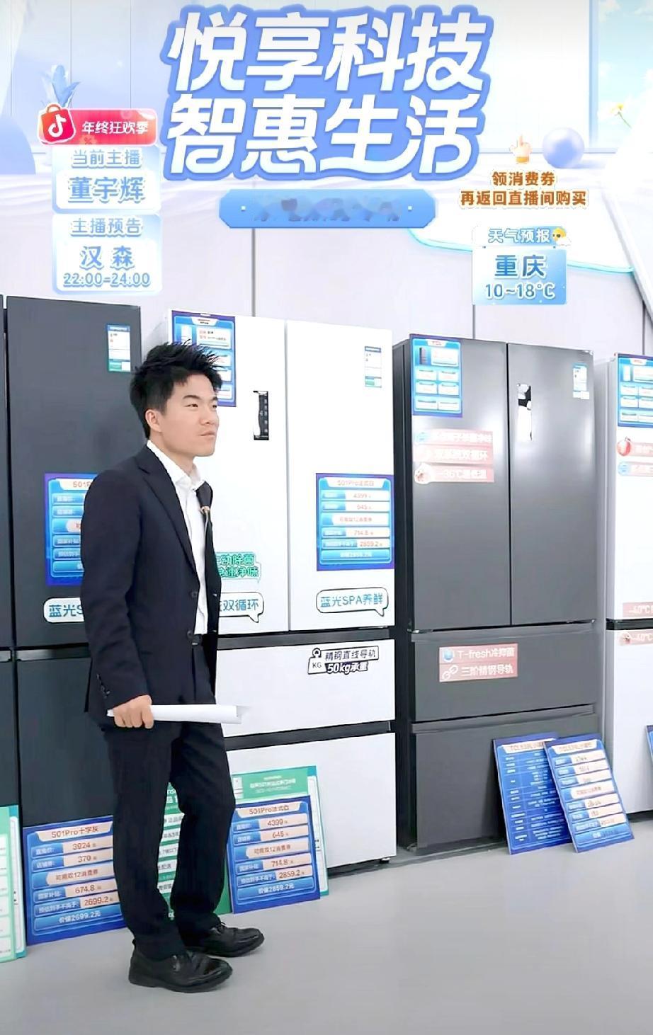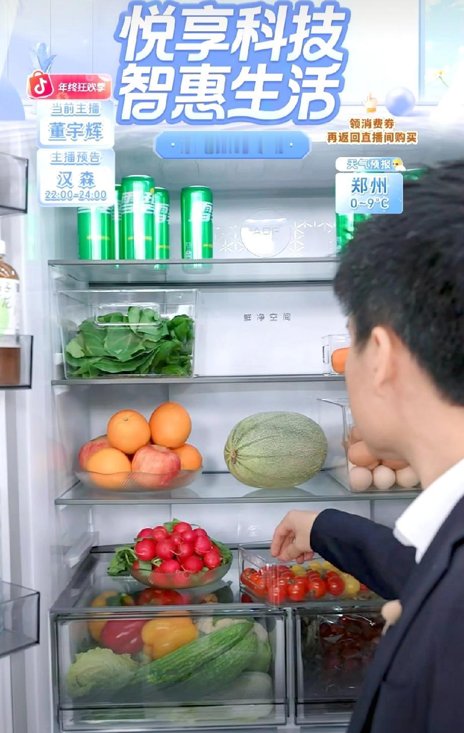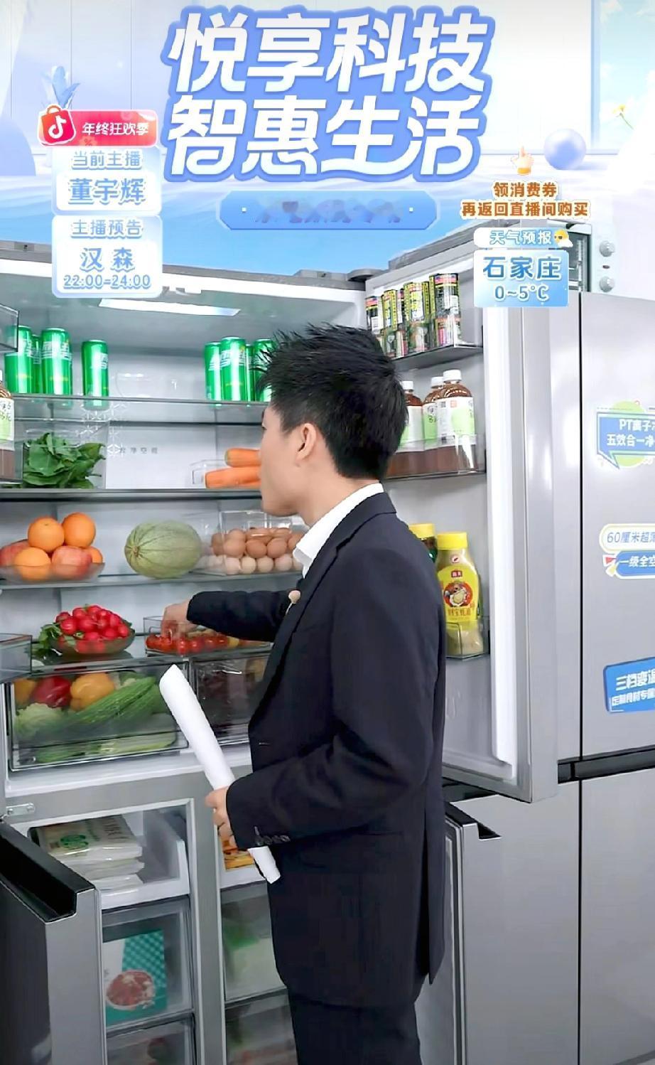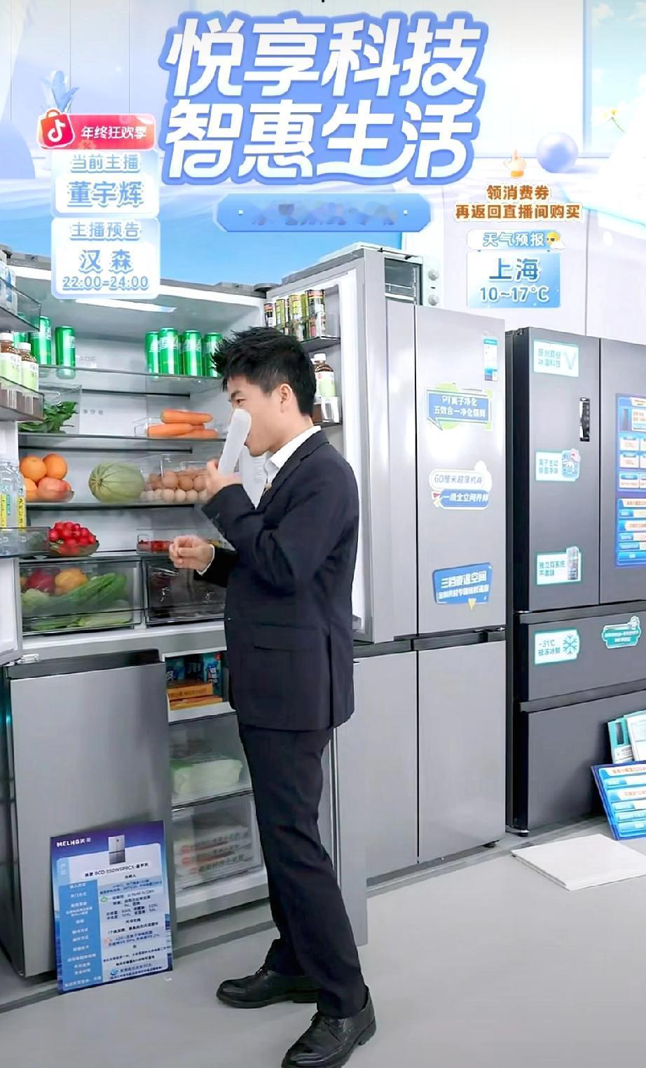 真的是“马骞指哪,老板讲哪”!这还有小番茄呢?我先吃一个,再来一个,再吃一个。 看董宇辉直播真是有趣! 董宇辉:“下面讲啥?” 马骞:“海尔。” 董宇辉:“是这个吗?好的!” …… 董宇辉:“还要讲啥?” 马骞:“美菱。” 董宇辉:“这个吗?好的!” …… 看着直播间的气氛,真是轻松、舒适、愉快、自由又自在。连消费者都觉得不是来购物的,而是来放松的。 这大概就是有些朋友本来就是来买个洗衣机,结果看了4小时直播,更有很多朋友并不需要购买电器,也在直播间里陪伴了几个小时的原因吧。 谁能想到电器专场,宇辉还能吃上水果呢?那一瞬间霸道总裁秒变一个突然发现了被藏起来的好吃的孩子,董三岁又瞬间上线啦! 董宇辉 与辉同行