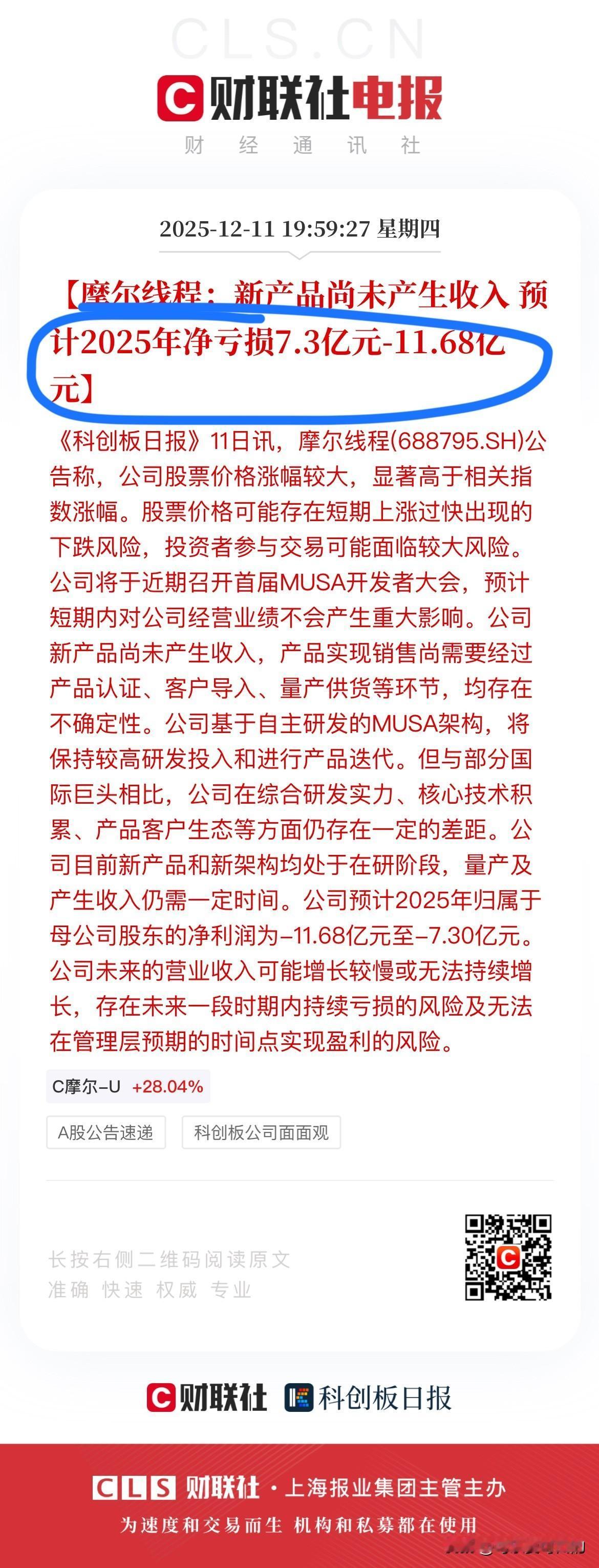 摩尔线程预计2025年净亏损7.3亿-11.68亿! 鉴于摩尔线程短期涨幅巨大,光今天一天就涨了28%,因此收盘后公司自己跳出来给股民降降温了! 但是亏不亏损的其实股民都无所谓的,哪个科技公司前面不都是亏损的,他们难道不知道摩尔近3年亏了50多个亿! 可是那重要吗?一点都不重要!所以明天搞不好摩尔线程还要创新高,还要大涨! 不过话虽如此,但是摩尔线程短期涨幅确实很大了,大家还是要注意风险!