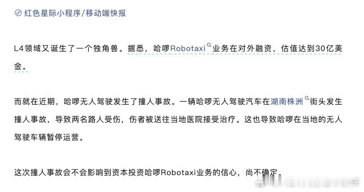 夸张,哈罗Robotaxi业务估值30亿美金?难怪Momenta、元戎、小鹏等一大批公司都在进入L4 / Robotaxi业务。新能源汽车