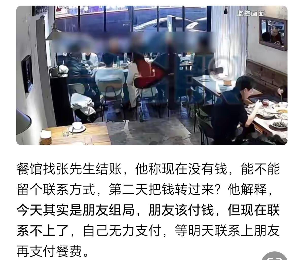 这真是一个神奇的饭局,10个人凑不出1200多元饭钱!话说,张先生一行10人,在朋友的组局下,去餐馆吃饭。他们从徬晚一直吃到深夜12点。 后来,也不知道怎么回事,只剩下张先生一个人留在餐馆里。其余人都“提前离开”了。于是餐馆工作人员找张先生结账,总共1262元。但是,张先生称自己没有,且这个饭局是朋友组织的。他需要联系朋友,转钱过来结账。 然而张先生却表示联系不上朋友,只能等明天联系上了,再来结账。于是餐馆老板选择了报警。但民警联系张先生的朋友后(组饭局者),对方却表示自己也没钱,需要筹钱结账。 最后在民警的协调下,张先生写下承诺书,承诺第二天18:00前来结账。但第二天,张先生反悔了,表示自己没钱,而且朋友也没把钱转给他。再则他的意思是,这个钱不应该他一个人来付,应该由他的朋友付。 据报道,后续餐馆也一直无法联系上张先生的朋友。也就是说那个组饭局的人,也在推脱结账。这就有点离谱了,一行10个人就餐,居然连1200多元的餐费都无法结。 就算一个人结不清,10个人aa制,每人120多元,也凑不出来吗?确实挺离谱的! 来源:滨州传媒网