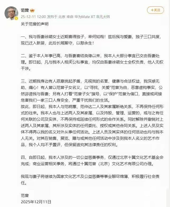 86岁的老画家范曾让小娇妻生出了儿子,而且这是范曾的第1个儿子。 范增有4次婚姻,第1次婚姻没添孩子,第2次婚姻添了一个女儿。第3次婚姻没添孩子,但是妻子带来两个儿子。第4次婚姻已经是80多岁时结的,居然生出了儿子。 老天真是后代男富翁啊,80多岁还能生出孩子。而女人奋斗事业,过了40岁再结婚,就很难有孩子了,50岁有孩子都已经很稀有了,60岁之后根本不可能有孩子,除非用供卵生别人的孩子。