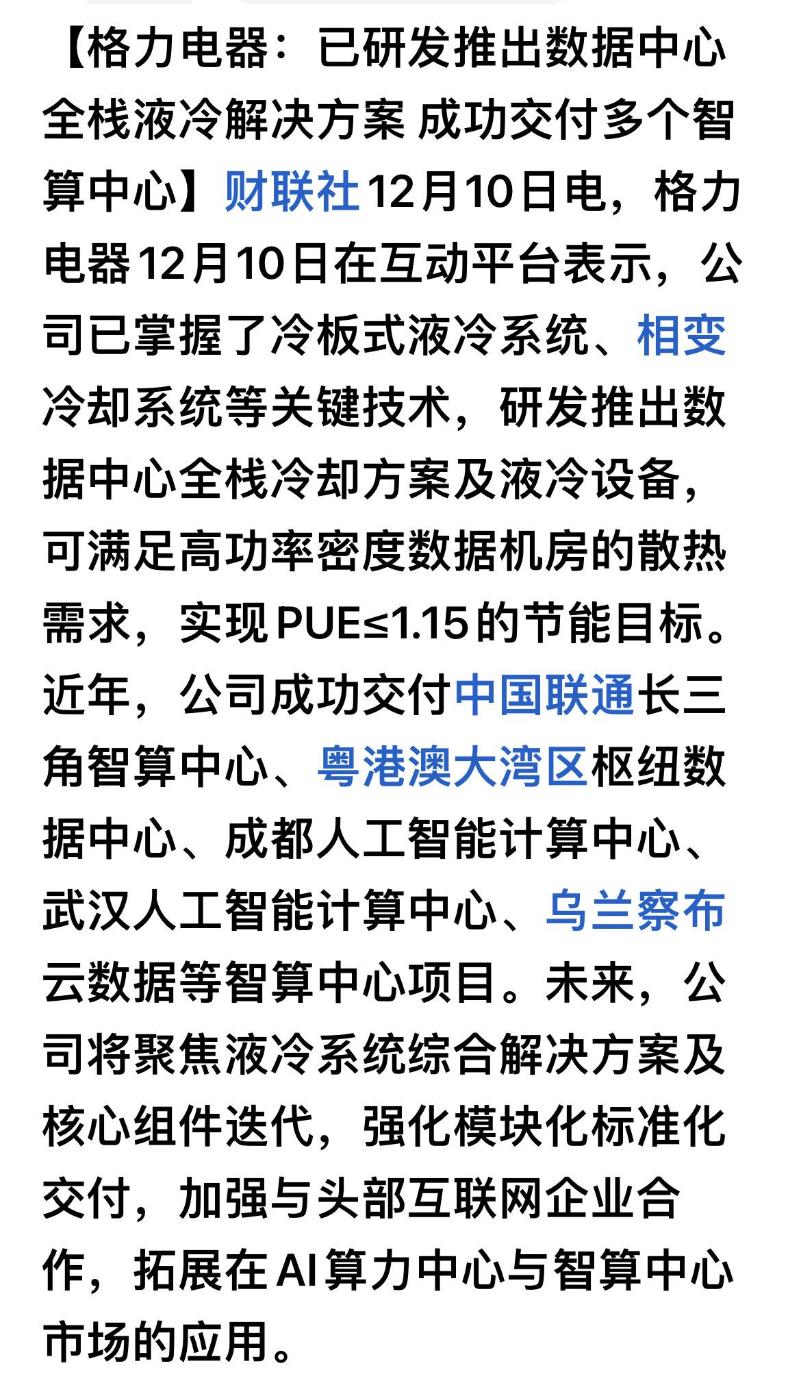 格力不造空调了?悄悄拿下国家级AI算力中心,真相来了! 别急着划走!格力最近干了件大事——它给AI服务器“装空调”去了,而且不是试水,是真交付! 很多人第一反应:“家电企业搞数据中心?靠谱吗?”但事实是:格力的全栈液冷解决方案,已经落地中国联通长三角智算中心、成都人工智能计算中心,还有粤港澳大湾区枢纽数据中心——全是国家“东数西算”重点工程。 关键数据更硬核:PUE≤1.15!啥意思?普通数据中心每用1度电,有0.6度浪费在散热上;而格力这套系统,几乎把浪费压到最低,一年省下的电费轻松过千万。 更让人安心的是“无水进机房”设计,彻底规避漏液风险——这可是互联网大厂最怕的“致命伤”。 说白了,格力不是突然跨界,而是把30年空调制冷技术“升级打怪”,用在了AI算力这个新战场。在“双碳”+AI爆发的双重风口下,这步棋,既稳又狠。 所以,别再说传统企业没机会了。格力正用实力证明:老本行的技术积累,也能撬动数字经济的新蓝海。 (注:信息基于格力官方披露内容整理,项目及技术指标均有公开依据)