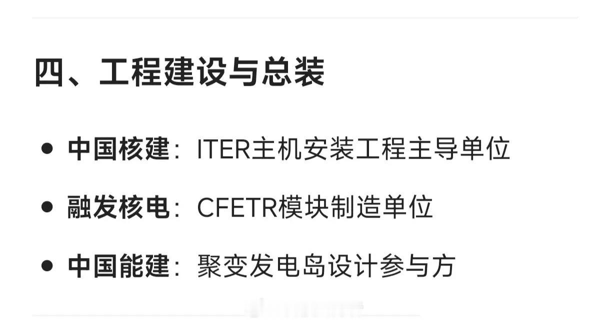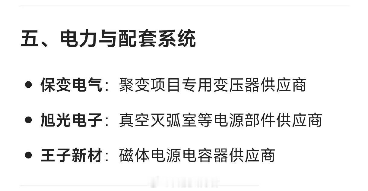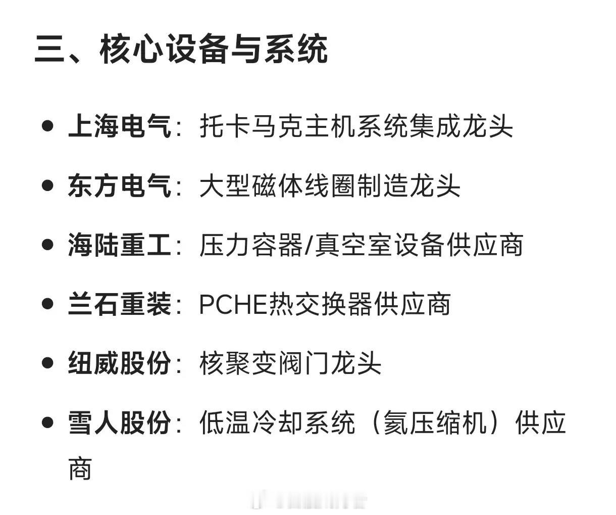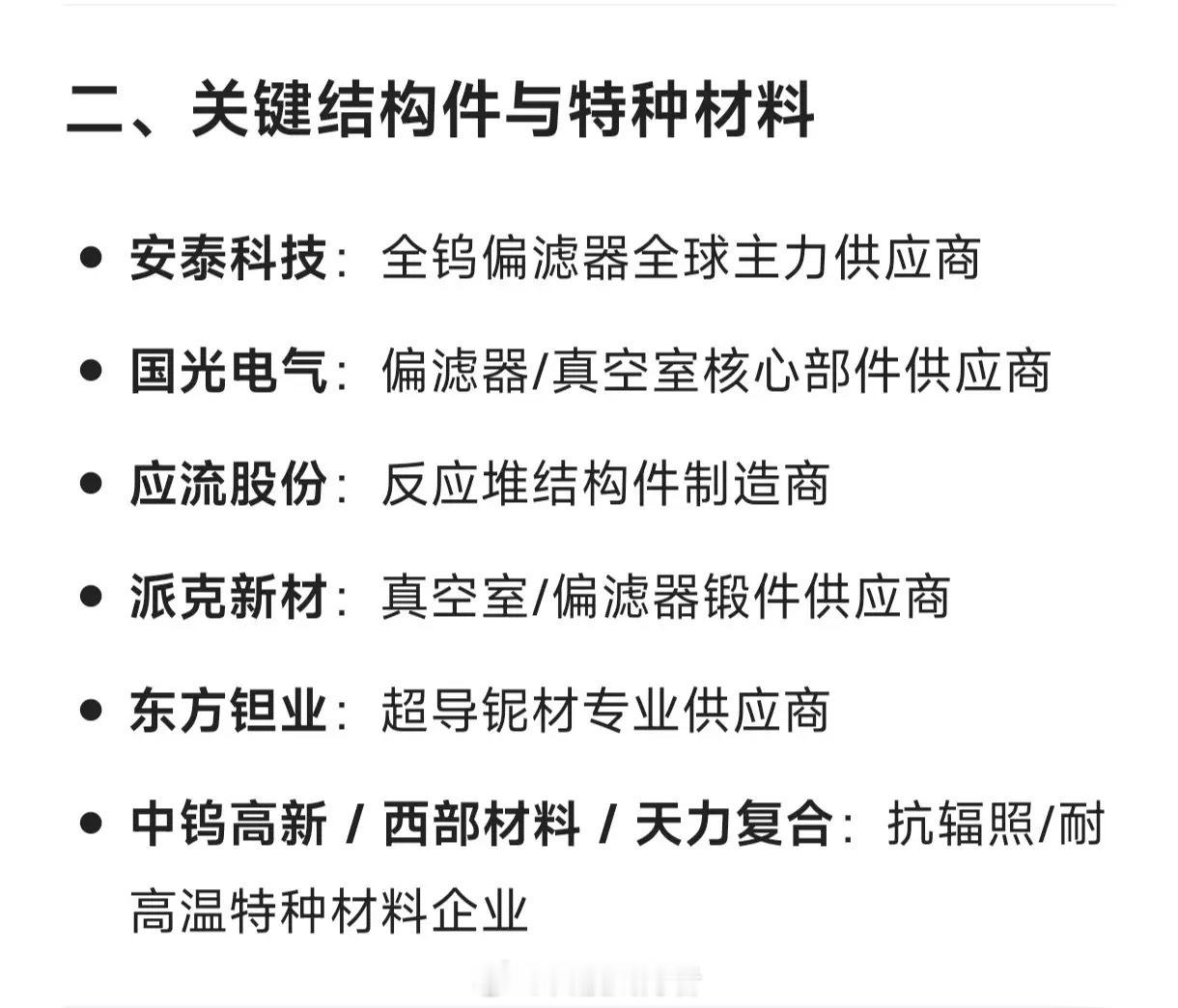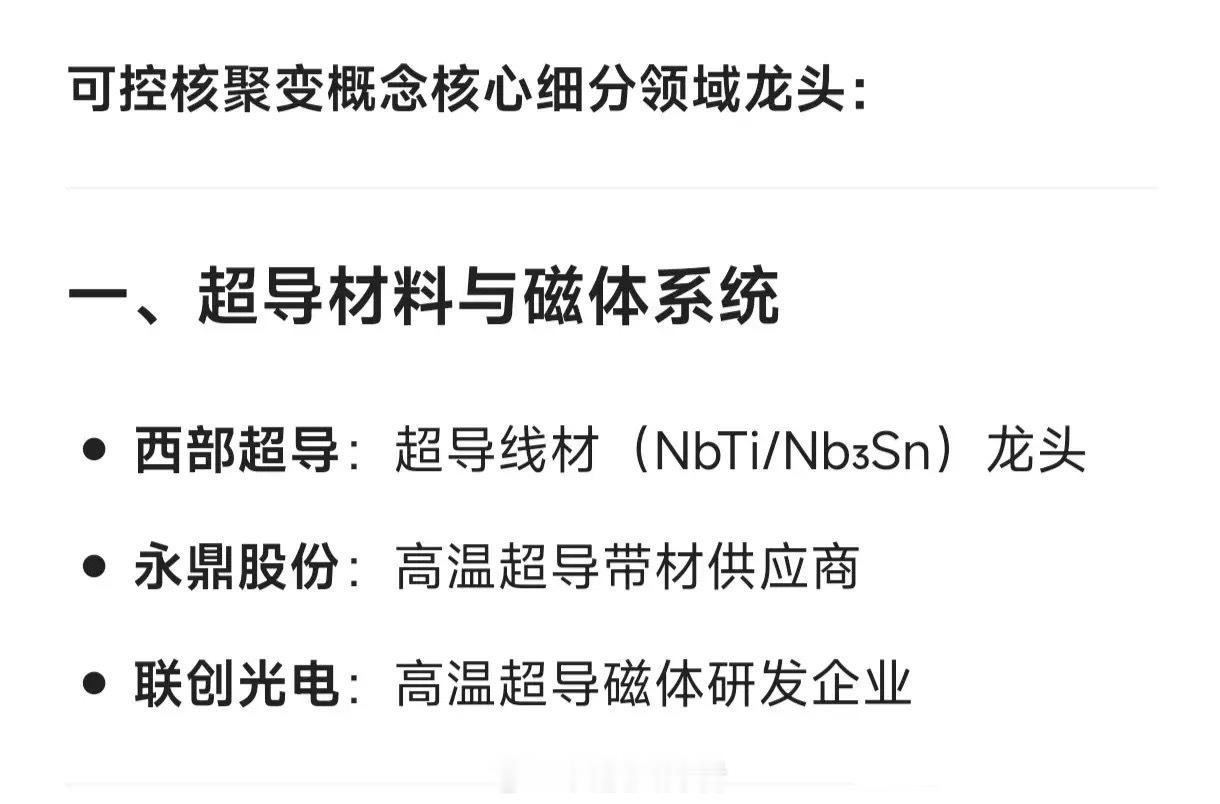 可控核聚变概念核心细分领域龙头梳理一、超导材料与磁体系统西部超导:深耕超导线材领域,NbTi、Nb₃Sn线材技术领先,是可控核聚变磁体系统的核心材料供应商,在高场超导领域占据重要地位。永鼎股份:聚焦高温超导带材研发与生产,其超导带材在聚变装置强磁场环境中表现稳定,为磁体系统提供关键材料支撑。联创光电:专注高温超导磁体研发,在磁体设计与集成领域积累深厚,技术方案适配核聚变装置的复杂工况。二、关键结构件与特种材料安泰科技:全钨偏滤器产品性能优异,成为全球核聚变装置的主力供应商,抗辐照与耐高温特性契合聚变环境需求。国光电气:深耕偏滤器、真空室等核心部件制造,工艺精度与可靠性获国际认可,是聚变装置结构件的关键参与者。应流股份:专注反应堆结构件定制化生产,为聚变装置核心部件提供精密制造支持,适配极端工况要求。派克新材:在真空室、偏滤器锻件领域技术领先,锻件强度与韧性平衡,满足聚变装置高压、高温环境需求。东方钽业:超导铌材专业供应商,铌材纯度与加工精度适配超导磁体制造,为聚变装置关键材料提供保障。中钨高新/西部材料/天力复合:专注抗辐照、耐高温特种材料研发,其钨基、钛基复合材料在聚变装置结构件中应用广泛,性能适配极端环境。三、核心设备与系统上海电气:托卡马克主机系统集成龙头,具备全套主机设计与集成能力,在聚变装置总装领域经验丰富。东方电气:大型磁体线圈制造标杆企业,线圈绕制精度与稳定性领先,支撑聚变装置强磁场构建。海陆重工:深耕压力容器、真空室设备制造,产品密封性能与耐高压特性适配聚变装置真空环境。兰石重装:PCHE热交换器技术领先,高效传热性能满足聚变装置热能管理需求,为系统稳定运行提供保障。纽威股份:聚变装置专用阀门研发领先,耐高压、抗腐蚀特性适配极端工况,保障流体控制系统安全。雪人股份:低温冷却系统(氦压缩机)核心供应商,为聚变装置提供精准温控支持,确保超导磁体等部件处于低温工作环境。四、工程建设与总装中国核建:主导ITER等国际聚变项目主机安装工程,具备大型复杂装置安装调试的丰富经验,是聚变工程建设的核心力量。融发核电:深度参与CFETR等国内聚变项目模块制造,在模块化建造领域技术突出,提升工程建设效率。中国能建:参与聚变发电岛设计,在能源系统集成与优化领域提供专业方案,助力聚变能量转化与传输。五、电力与配套系统保变电气:定制化聚变项目专用变压器,适配聚变装置特殊供电需求,保障电力传输稳定。旭光电子:真空灭弧室等电源部件性能可靠,为聚变装置电源系统提供关键组件,确保电力控制安全。王子新材:磁体电源电容器技术领先,适配聚变装置强电流、高稳定性供电需求,支撑磁体系统高效运行。