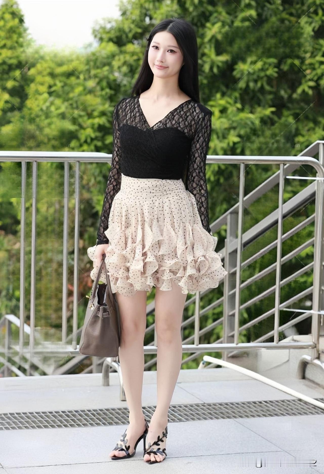 优雅黑纱上衣搭配甜美荷叶裙,气质满分