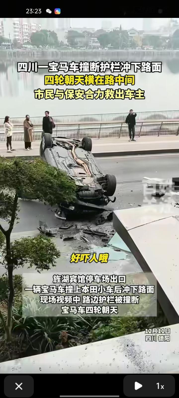 12月11日,四川德阳。旌湖宾馆停车场出口有辆宝马车撞上本田小车冲下路面,路边护栏被撞断,宝马车四轮朝天。有目击者称,事发后,他与保安一起将车主救出,交警赶到现场进行清理作业。15时许,辖区交警称目前事故路段可正常通行。 事故终会平息,道路终将畅通,但安全的弦却一刻也不能松。庆幸于危难时刻的伸手相助,希望遇险车主的安然无恙。愿每一次出发、每一次抵达都带着平安。