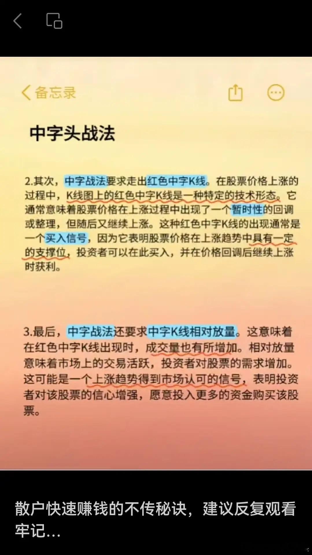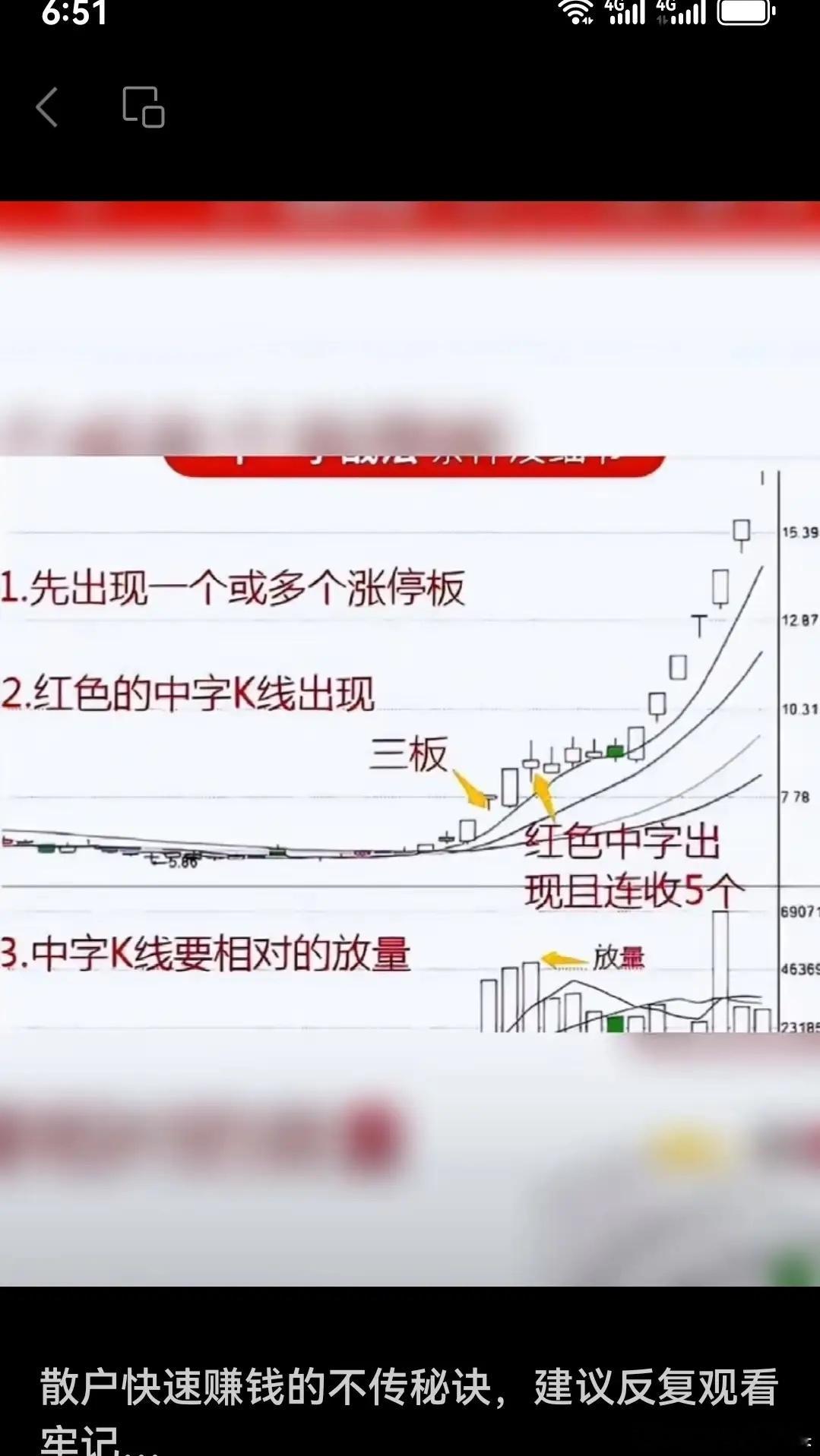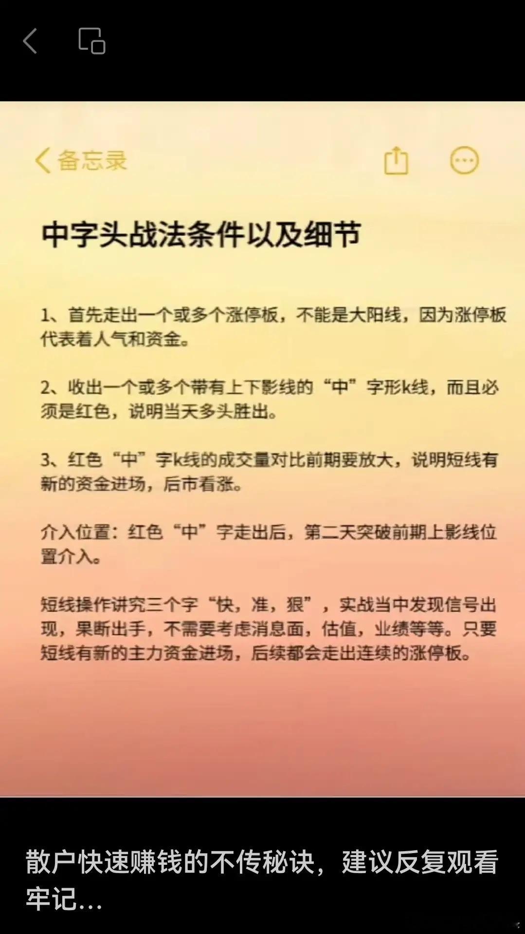 股票K线中字头及图例核心是涨停启动→红色中字K线→放量→次日突破,抓接力主升浪。 1. 形态定义:涨停后出现带明显上下影线的红色K线,实体不长,形似“中”字,代表多空分歧后多头胜出。2. 关键条件启动:先有1个以上封死涨停。形态:涨停后次日收红色中字K线,上下影清晰、实体小。量能:中字K线当天温和放量(1.5-2倍均量,非爆量),新资金接力。入场:次日放量突破中字K线的上影线高点,可介入。