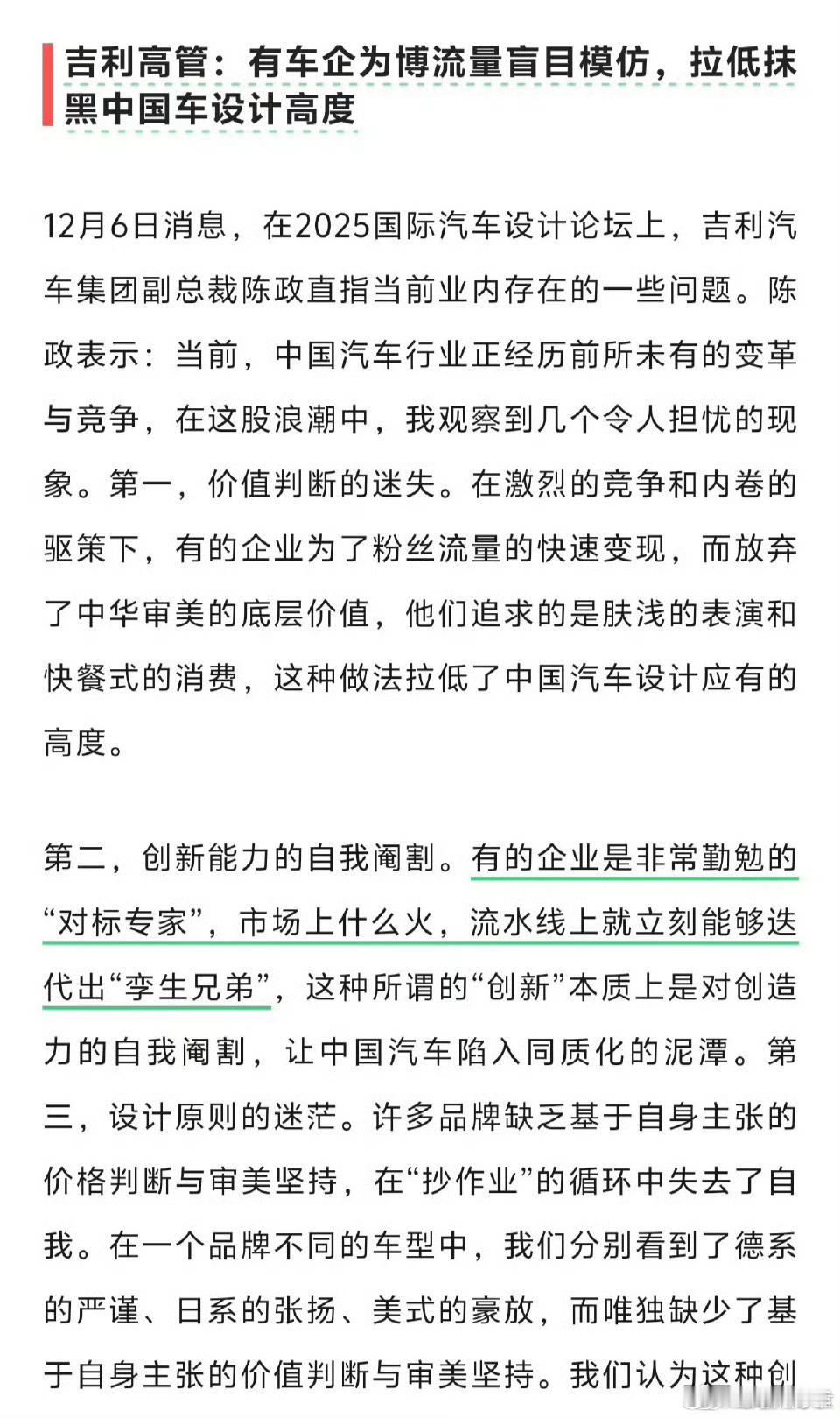 汽车民生 【他讲了大实话,汽车圈大佬集团沉默!】“价值判断迷失、创新能力自我阉割、设计原则迷茫”,这是吉利汽车集团副总裁陈政直言当前汽车行业存在的问题(以上三个问题陈政做了相关解释可看下面的图文)。在我看来,陈政列出的问题,主要集中在汽车企业价值判断趋同、汽车同质化严重、外观设计雷同上。这些问题的提出,是对行业深刻洞察后的反思。有没有道理?整个汽车圈大佬集体沉默就是答案!中国车市确实好起来了,中国新能源汽车的发展正走在弯道超车的路上,中国车在造车者看来已经超越了很多合资车……面对一个个喜讯,各方都很高兴、开心!但是,需要指出的是,这种繁荣,更多是“造出来”的,如果没有国家英明的新能源汽车发展战略,不给新能源车企各种补贴,不免新能源汽车购置税,地方政府不补贴新能源车主,不推出以旧换新政策,等等,你还觉得中国车会超过合资车吗?其实答案车企心里门清。而为了活着,为了追求短期利益,结果就陷入了陈政所说的“价值判断迷失、创新能力自我阉割、设计原则迷茫”的怪圈。君不见,现在车市的怪象很多吗?看别人推出“方盒子”硬派越野、SUV比较畅销,于是大街上满是“方盒子”在跑;冰箱、彩电、大沙发本是放在家里用的,结果被车企搬到车上,于是其他车企发现了窍门,也一个接一个地往车上搬;智驾系统成了新能源车的标配,车企生怕自己不装就卖不动;看“付费升级”还能再赚一把,各车企相继推出升级业务,你不买我打折看你动不动心;如果新能源车不配激光雷达,光配置这一块可能就输给了竞品,于是,你装我也装;大家都将纯电车的前脸设计成封闭式,如果我不这样设计可能就会被误解成不是纯电车(难道就没有更好的设计方案代替吗);隐藏式门把手有多少人因为外面无法开门闷在车里出不来的?但是这样设计科技感很强啊,车企都不舍得放弃;三联屏是个好东西,最开始很多车企都互相比拼看谁装的三联屏长,看谁装得又长又宽,后来发现成本高,有的车企放弃了,但有的车企自家的车造得不怎么样,三联屏却是不缺的……可想而知,这样相互模仿地造车,吃亏的永远是那个埋头苦干搞创新的人。长此以往,大家都不去创新,模仿呗,于是有的“模仿家”比造车专家模仿得还好,还高大上,真是徒弟超过了师傅,是谁就不用我多说了!模仿成风,同质化严重,靠抄袭上位,在中国车市比比皆是,任其下去,势必会扼杀创新。我们好不容易在弯道超车的路上积累一点成果,可能还来不及庆祝,恐将被合资车的创新包抄,将江山拱手让人!