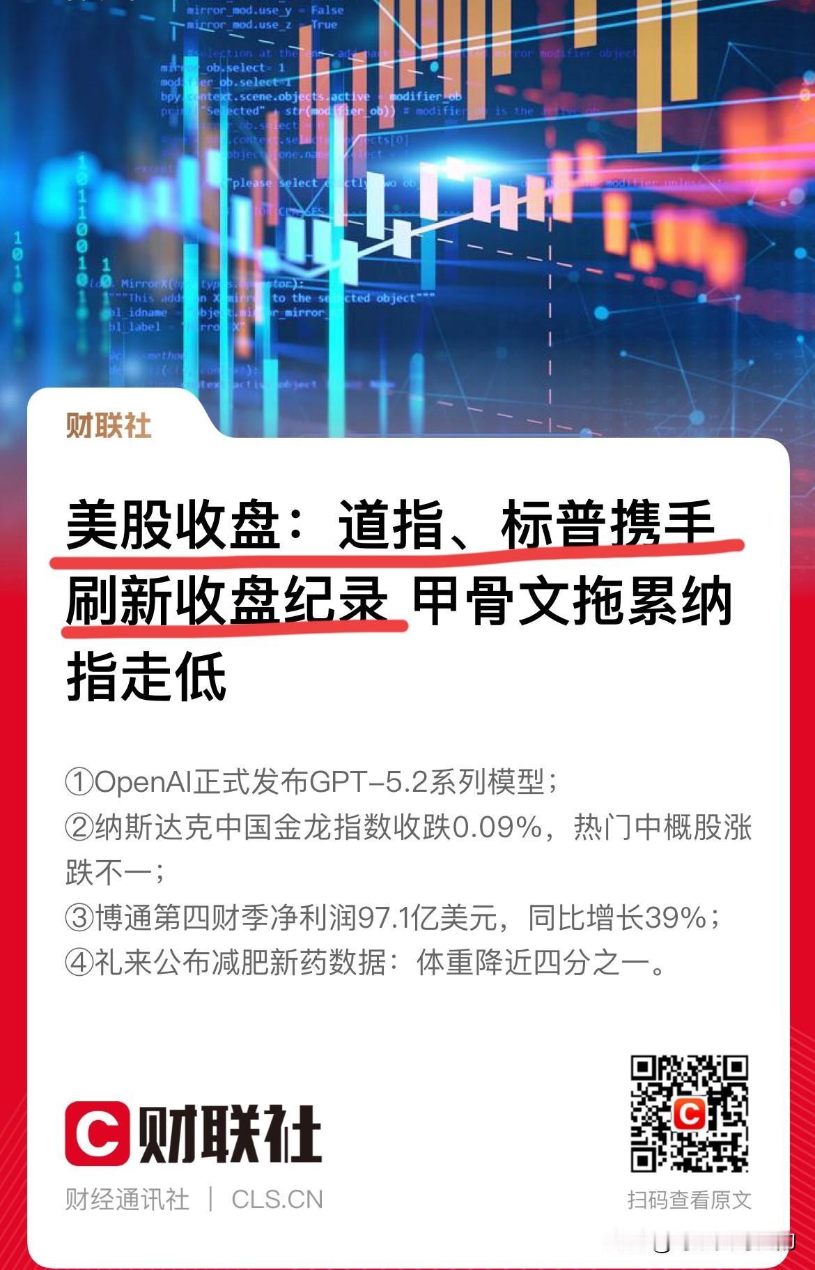 美股又又又新高了!大A今天应该能涨了吧? 昨晚在纳指和标普大幅低开的情况下,道指却是小幅低开,而在开盘后则是一路上扬,很快就突破了前高,最终创下了48756.34的新纪录,距离5万点只有一步之遥了! 而标普虽然低开,但是却是顽强的在尾盘翻红,虽然指数未能创新高,但是却是创下收盘新高! 昨晚科技股普跌,英伟达一度跌近4%,收盘仍跌1.8%,甲骨文因为业绩不及预期一度跌超16%,收盘仍下跌10%!因此纳指盘中也一度跌了1.4%,不过尾盘跌幅大幅收窄,收盘仅下跌0.25%! 美股昨晚那么给力,而大A昨晚也传出要收拾量化,要知道大A股民可是苦量化久矣! 总之,希望今天能涨一天吧,真的是太难受了!