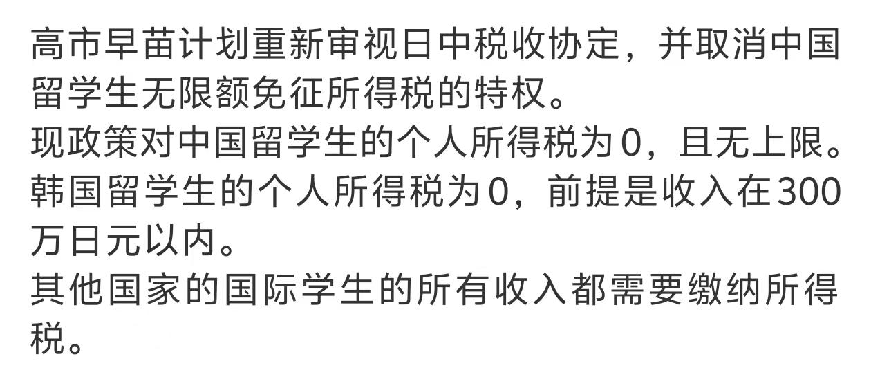 过分了啊,谁能想到,实行了42年的中国留学生日本免税特权,竟要被高市早苗一刀砍掉! 这意味着超12万在日中国留学生,今后打工收入再也不能免税,得和其他国家留学生一样缴所得税,而此前中国留学生的免税政策本是无上限的,韩国留学生也仅300万日元内免税。更狠的是,高市早苗还盯上了中国跨境电商征税,严查公寓转售逃税,甚至限制有拖欠医疗费记录的外国人入境。 一系列操作下来,不少人直言,这哪里是调整政策,分明是在助长日本的排外情绪,让在日中国人的生活门槛越抬越高!