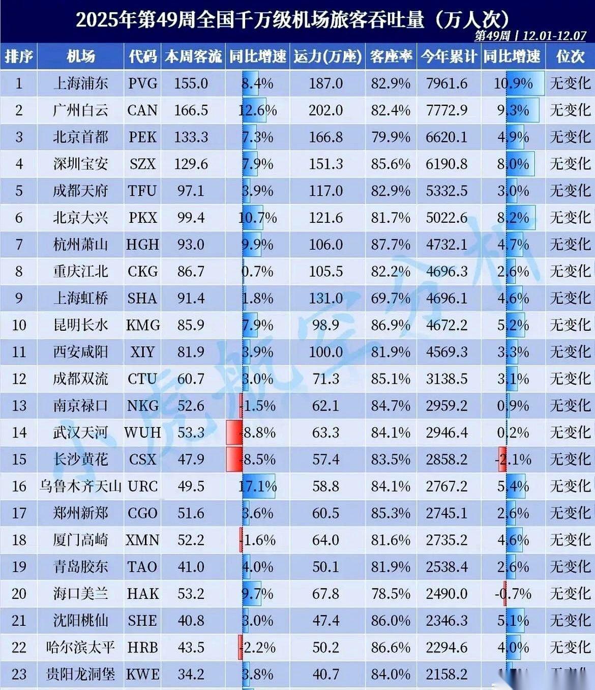 昆明长水,今年破5000万的目标,眼瞅着又悬了。 就差最后三周,一年一度的机场“大考”进入冲刺阶段,简直比看球还刺激。 北上广那几个大佬,基本是神仙打架,早就锁定胜局了。上海浦东下周就破8000万,广州也稳稳跟上,北京首都也重回7000万俱乐部。人家那是另一个维度的故事,我们看看就好。 真正的好戏,全在5000万这个档口。 杭州今年是真争气,一只脚已经迈进去了,肉眼可见的稳。 最猛的是上海虹桥,跟打了鸡血似的,疯狂加运力,硬生生把量给堆上来了,眼看下周就要把重庆给超了。 最揪心的就是重庆。本来唾手可得的荣誉,现在被后面的人追得冷汗直流,最后这二十几天,一口气都不能松。 唉,说回昆明。 从2017年就开始盼,年年盼,年年就差那么一口气。你说气不气? 今年估计也就定格在4950万了,又是一个无限接近的数字。 不过话说回来,一座常住人口不到千万的城市,能做到这个份上,真的,已经是个不大不小的奇迹了。 差的那50万,不是遗憾,是明年再出发的念想。