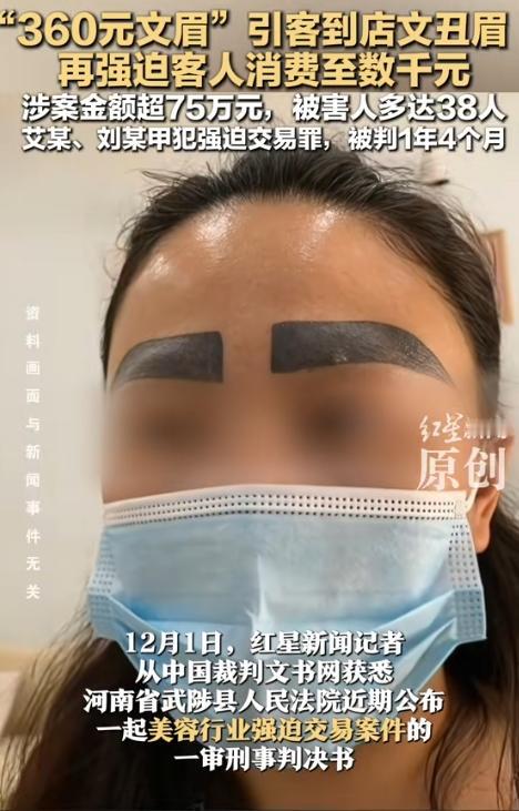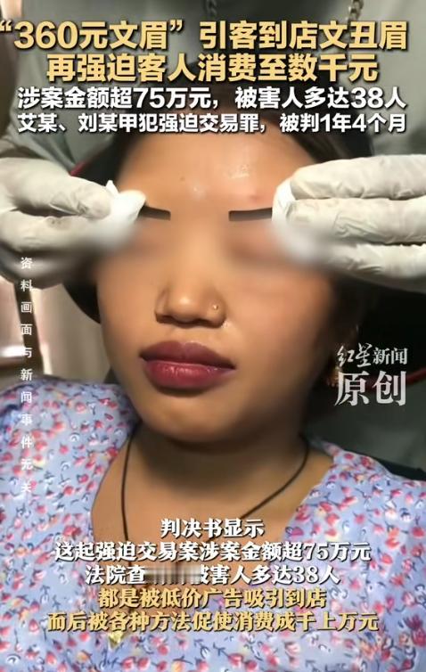 判的太轻了,真是丧心病狂!河南一环卫工人看到低价的纹眉,就去做了,谁知商家故意做“做黑做丑”,少放舒缓胶,细针换成粗钢针,让顾客疼痛难忍,不得不选择几千块的纹眉,要修复还还要上万块。 “你做的是特价眉,用的就是粗针,疼是应该的!” 一家美容店的员工冷冰冰的说道。而听着这话,忍着剧痛的人,是一位本想花360元纹个眉的环卫工张大姐(化名)。 张大姐迫于店员的压力,被迫付了2万块。这钱,她要扫很长时间大街才挣得回来。 事情发生在2024年春天。张大姐在网上看到“360元特价纹眉”的广告,觉得价格合适,就去了广州天河区的一家美容店。她怎么也想不到,自己走进的是一个设计好的“坑”。 躺下后,纹绣师根本没好好设计,故意把她一边眉毛纹得又粗又丑。这还不够,为了让张大姐难受、好逼她加钱,店员还耍了心眼:要么少给她涂麻药,要么故意换更粗的针来扎。张大姐实在是疼得受不了,他们就在一旁冷冷地说:“特价的就是这样,疼点正常。” 纹完了,店员不让走。他们把她围在中间,拿出漂亮的图片跟她刚纹坏的眉毛比,不停地说:“你看这多难看,不出门啦?得加钱做贵的套餐才能改好。”从上午十点多,一直耗到晚上,好几个店员轮流上来“劝”,连上厕所都有人跟着。 在这种又累又怕的压力下,张大姐最后扛不住了,迷迷糊糊地付了2万块钱。对她来说,这简直是天文数字。 事情最后还是有了结果,在2024年底,河南武陟县法院判了这个案子,真相才大白。这家店背后是一个有组织的团伙,专门在网上用“超低价”广告吸引人,盯上的就是像张大姐这样心疼钱、可能不太懂怎么维权的人。 等顾客一进店,他们就按一套固定流程来:先做丑、做疼,再一群人围着吓唬你、不让你走,直到你交钱升级成几千甚至上万的套餐。 法院查清了,像张大姐这样被骗的人,至少有38个,总共被坑了超过75万元。这些人都是抱着简单变美的想法去的,结果却惹来一身麻烦和巨大的损失。 最后,法院判定店里的两个主要责任人犯了“强迫交易罪”,判了他们一年四个月的刑,还要罚款,骗的钱也得退。 这个案子也给所有人提了个醒:路边那些便宜得离谱的“美容”广告,千万要小心。这背后很可能不是馅饼,而是陷阱。这些骗子就是抓住了人们想省钱又爱美的心理。 还有,千万不要贪小便宜,价格低得反常的项目要警惕。一旦进了店,发现对方不是好好服务,而是好几个人围着你不停推销,甚至不让你自由离开,这就是危险信号。别犹豫,马上找机会报警。 如果可以,悄悄录音、留好付款记录,都是重要的证据。 我们每个人,在消费时多一份警惕,在权益受损时多一份勇气,就是在保护自己,也是在让那些骗子没有空子可钻。 信息来源: 裁判文书网|美容行业强迫交易案件 红星新闻|“360元文眉”引客到店文丑眉 再强迫客人消费至数千元 涉案金额超75万元 文|黑子 编辑|史叔