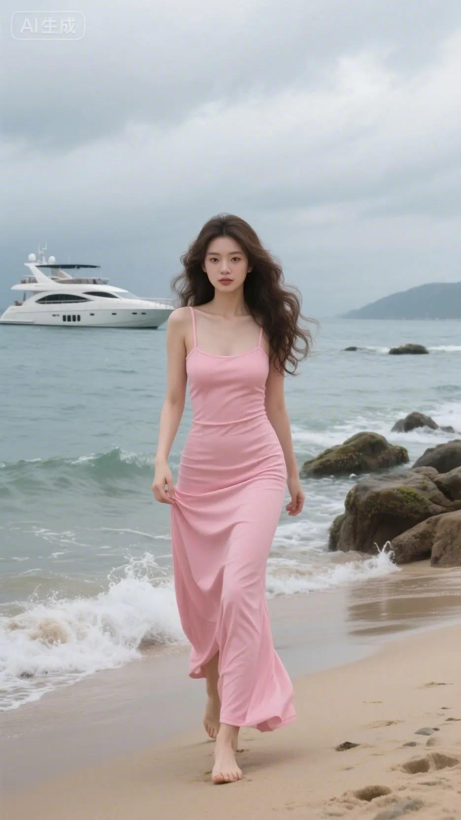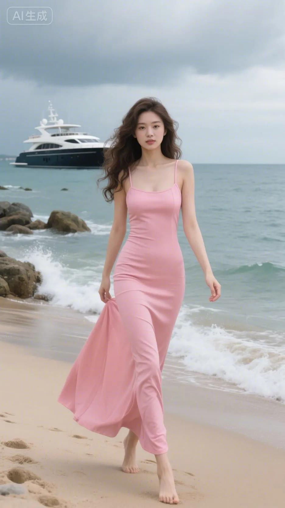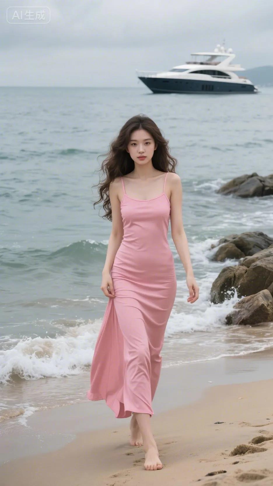 海边漫步,粉裙飘逸,尽享海风与阳光。