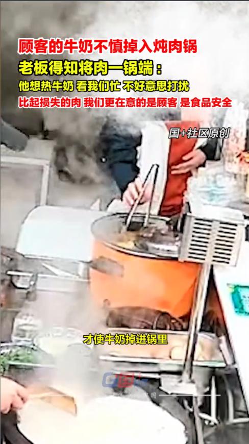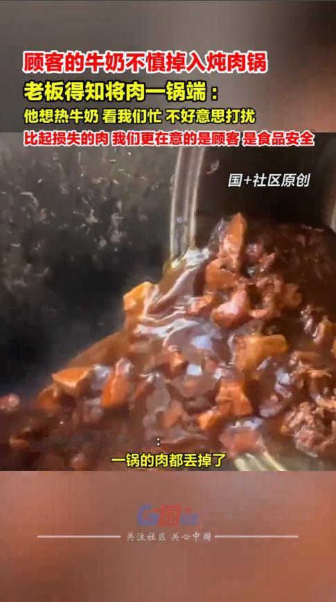 “这老板有格局!”12月5日,山东青岛,一男子买早餐时,见老板非常忙,就自己从包里拿出牛奶,打算放在锅盖上热一下,结果牛奶掉进了炖肉的锅里,老板得知后,担心顾客吃出问题,就将整锅肉都倒了!网友:应该让顾客买下来。 现在很多人忙于工作,一日三餐都没有时间吃,几乎没有人还在家里做饭了,稍微注重点身体的,还能在早上去买份早餐,然后狼吞虎咽的吃完去上班。 男子和妻子开了一家早餐店,当天早上,男子正在后面忙碌,妻子则在前面做着早餐,在一旁等候的一名顾客见状,也不忍心打扰他们,于是就从包里拿出牛奶,打算自己热一下。 只是没想到,意外还是发生了!牛奶压垮了锅盖,直接掉进了肉锅里,整锅肉都跟着遭了殃,虽然顾客及时将牛奶捞了出来,但是男子不确定牛奶都接触到了什么东西,万一有不干净的东西混进肉里,顾客吃了是要出大事的。 为了防止这一状况的发生,男子直接将一整锅的肉全都倒掉了! 虽然损失了好几百块钱,但是男子却觉得就应该这么做,不能为了挣钱,就把顾客的安全置之度外,做餐饮的,必须严格把控食品的质量。 网友看后纷纷点赞,认为老板的做法很正确,万一这男的就是故意的,到时候可真就赔大发了,这种警惕性还是要有的! 信息来源:《12月5日,山东青岛。顾客的牛奶不慎掉入炖肉锅,老板得知将肉一锅端 :比起损失的肉,我们更在意的是顾客,更重视的是食品安全。》国+社区