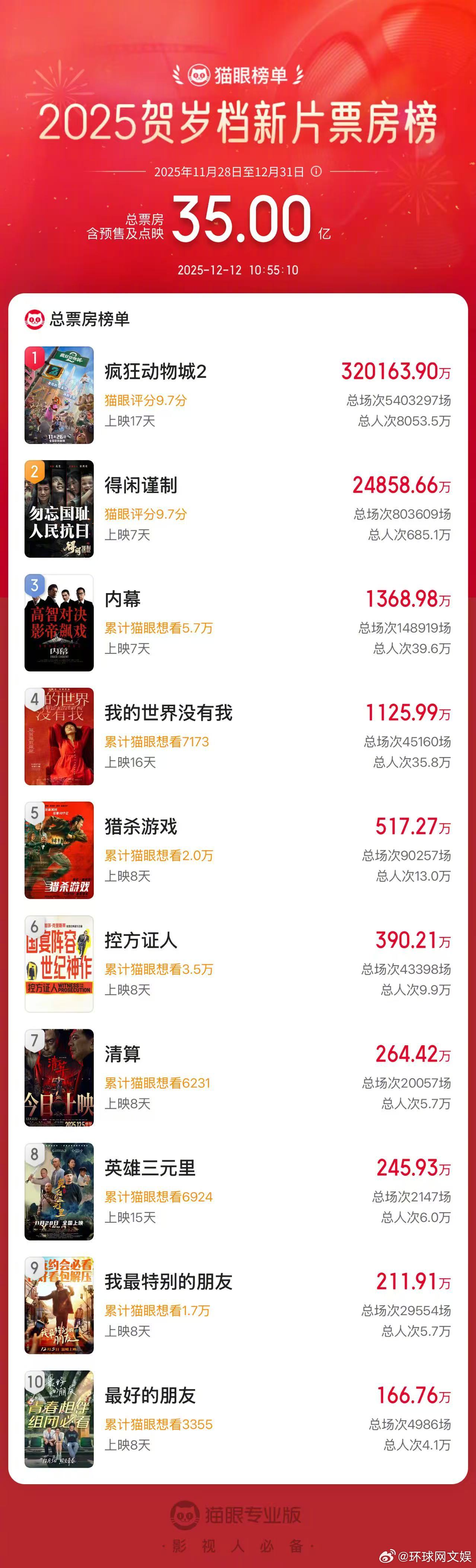 【#2025贺岁档新片票房破35亿# 】据猫眼专业版数据,截至12月12日10时55分,2025年贺岁档新片总票房突破35亿。截至目前,2025贺岁档新片票房前三为:1.《#疯狂动物城2#》2.《得闲谨制》()#得闲谨制# 3.《内幕》吴镇宇()