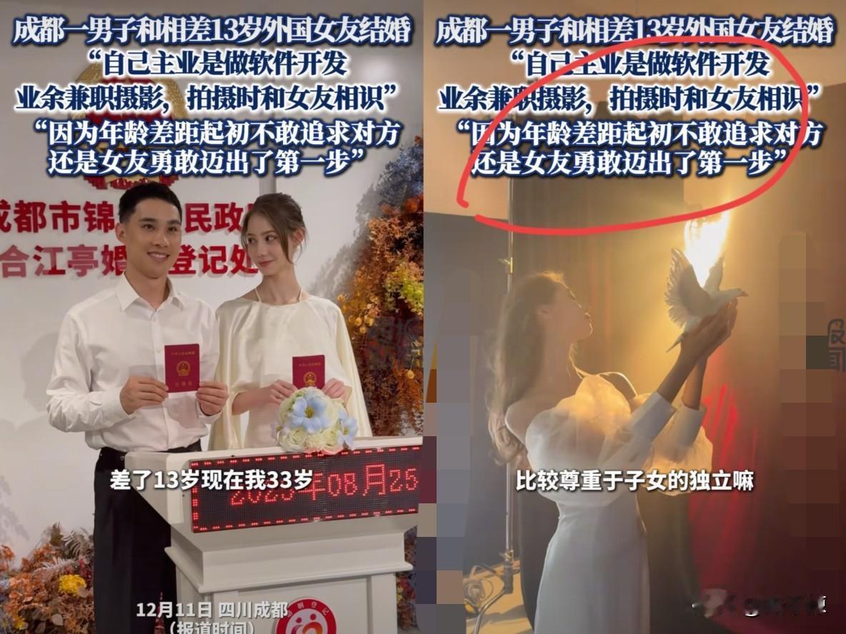 爱情不分国籍!四川成都,一名33岁男子和20岁的外籍女友结婚,让人意外的是,并非是男子主动追求,反而是女友迈出第一步,这波操作真的打破太多刻板印象! 男子介绍自己兼职摄影,妻子是模特的,擦出来爱情的火花! 网友调侃“学摄影还来得及吗”,但懂的人都知道,能跨越13岁年龄差、跨国界的,从来不是职业光环! 镜头前后的相遇是契机,真正戳中人心的,是两人同频的节奏和敢爱的勇气! 女孩顶着家人反对远嫁他乡,不是一时冲动,而是认定了彼此愿意磨合的真心! 跨国恋哪有那么多风花雪月,不过是你学我的家常菜,我懂你的冷笑话,隔着时差也愿意维系彼此家庭的用心! 现在太多人把爱情框在条条框框里,却忘了最好的感情从来是双向奔赴! 年龄、国籍从来不是阻碍,敢主动、肯包容才是必杀技! 她在异国他乡工作,主动选择了爱的人,还说服了家人!