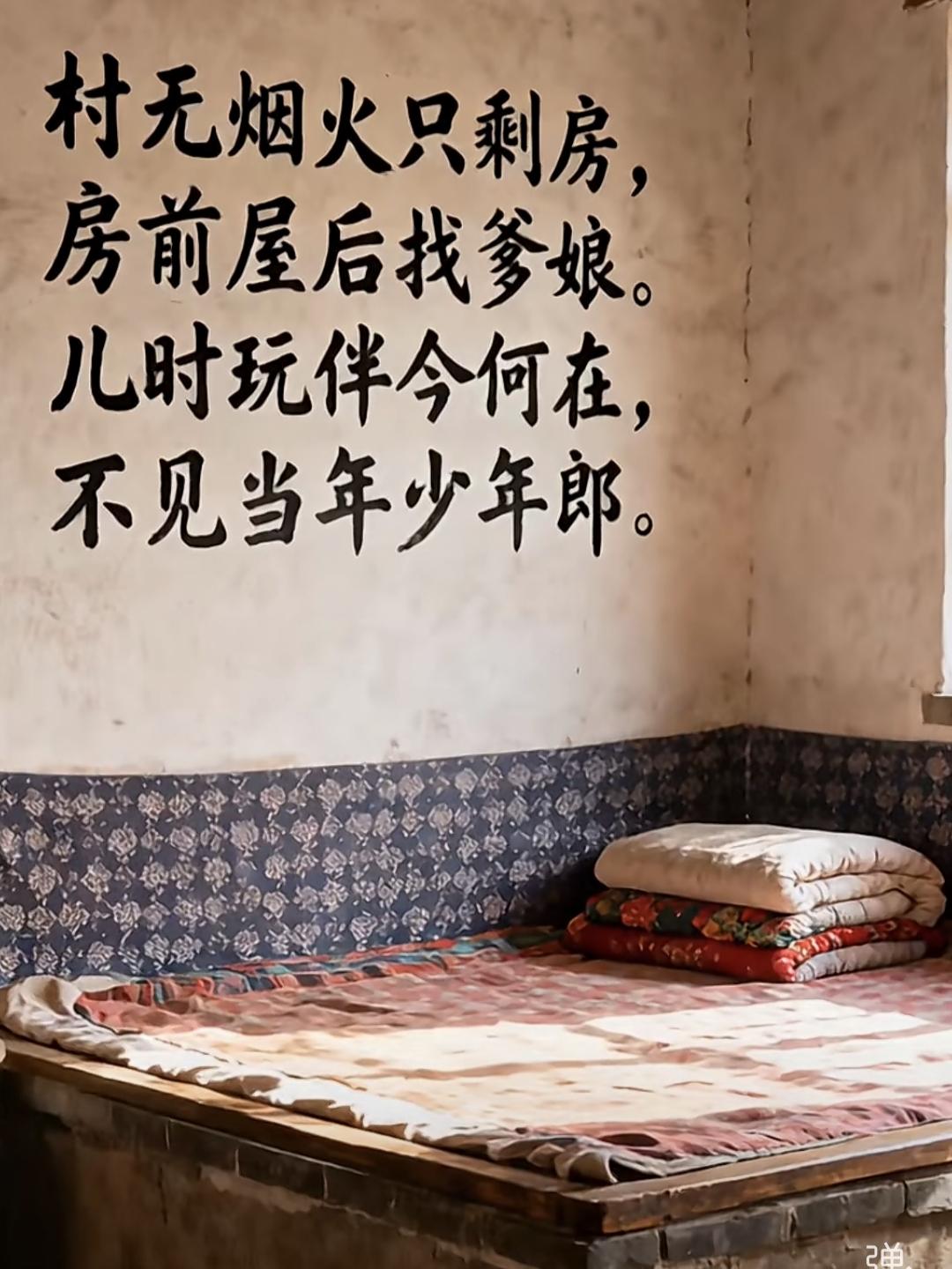 山坡羊·故村寻旧 村无烟火, 房余空舍, 房前屋后寻亲舍。 忆童娃,念爹妈。 儿时玩伴难寻那, 不见当年青俊雅。 人,何处呀; 村,依旧嘛。