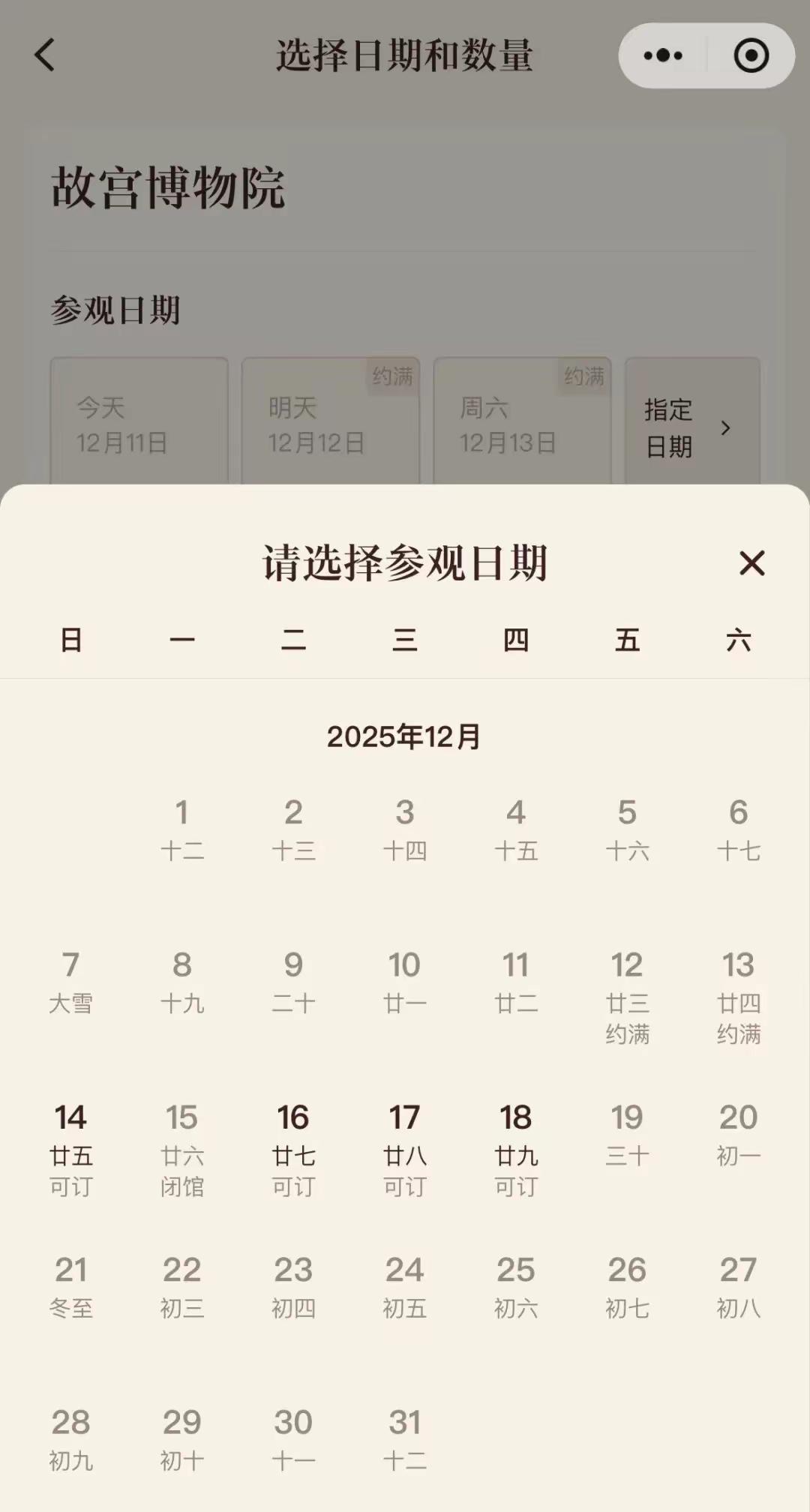 北京暴雪预警中故宫票约满 公园管理中心发布雪景打卡地图:北京暴雪蓝色预警中,明天城区将有明显积雪。故宫博物院小程序显示,12月12日全天、13日全天及14日上午门票皆已约满。12月11日晚,北京市公园管理中心发布“雪景打卡地图”,推出40余处打卡点位,市属公园已做好积雪清理、防滑保障及暖心服务,并提醒游客做好保暖、穿防滑鞋,注意安全。