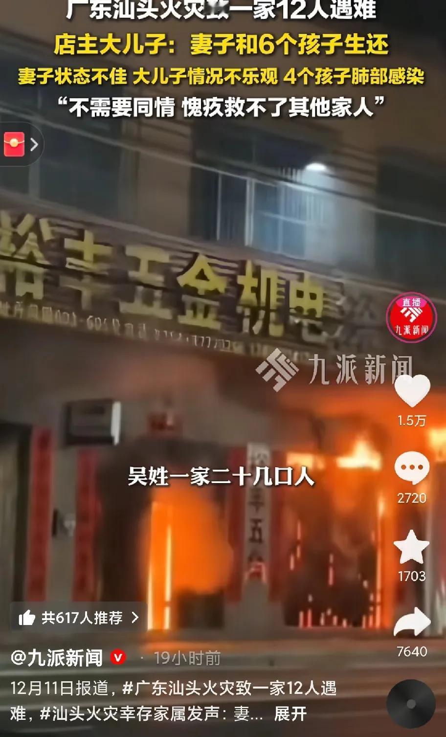 汕头火灾全家12人遇难,大嫂带着6个孩子逃生,万万没想到,逃跑背后竟是妈妈独自带2小儿子跑出来,10岁大女儿自己冲出大门,2个姐姐和1个妹妹都躲在阳台,最后被消防员救出。 有人做了统计,住在四楼的爷爷奶奶,二哥三哥一家全都没了,住在三楼的大哥一家活了下来。 有人猜测是因为浓烟都是往上跑的,很多人都不是被火烧死的,而是被烟呛死的。 说实话,我觉得广东潮汕真的太能生了,仅大哥一家就有6个孩子,四个女儿,两个儿子,当他们家的女儿还真得独立自强啊。