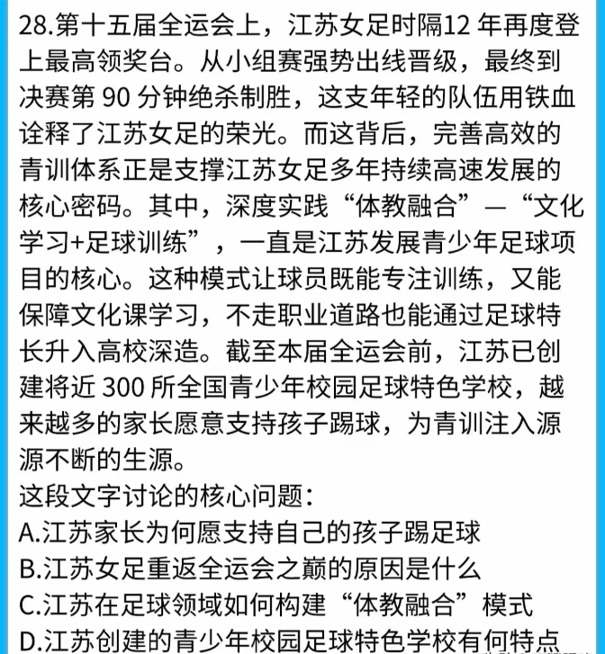2026江苏公务员考试,考到了足球题,很多辅导机构给出的答案是B,认为江苏经常考“某某的原因”的文段,可以秒杀B。但青眼看球认为这题的答案应该是C,因为根据文段脉络,江苏女足夺得全运会冠军,只是起到了引入话题的作用,并不是全文的重点,全文真正的重点是体教融合。 体教融合是授之以渔,江苏夺冠是授之以鱼,高下立判。 江苏苏宁夺得了中超冠军,依然难逃解散的命运。 江苏女足的全运会冠军含金量远不如中超冠军,一年后就会被人淡忘。 真正让球迷铭记的是,体教融合的足球培养理念。 如果能做到体教融合,江苏足球还会有新的中超球队。 B选项说的只是皮毛,根本不懂足球。 C选项说的才是本质,抓住了足球运动的发展规律。