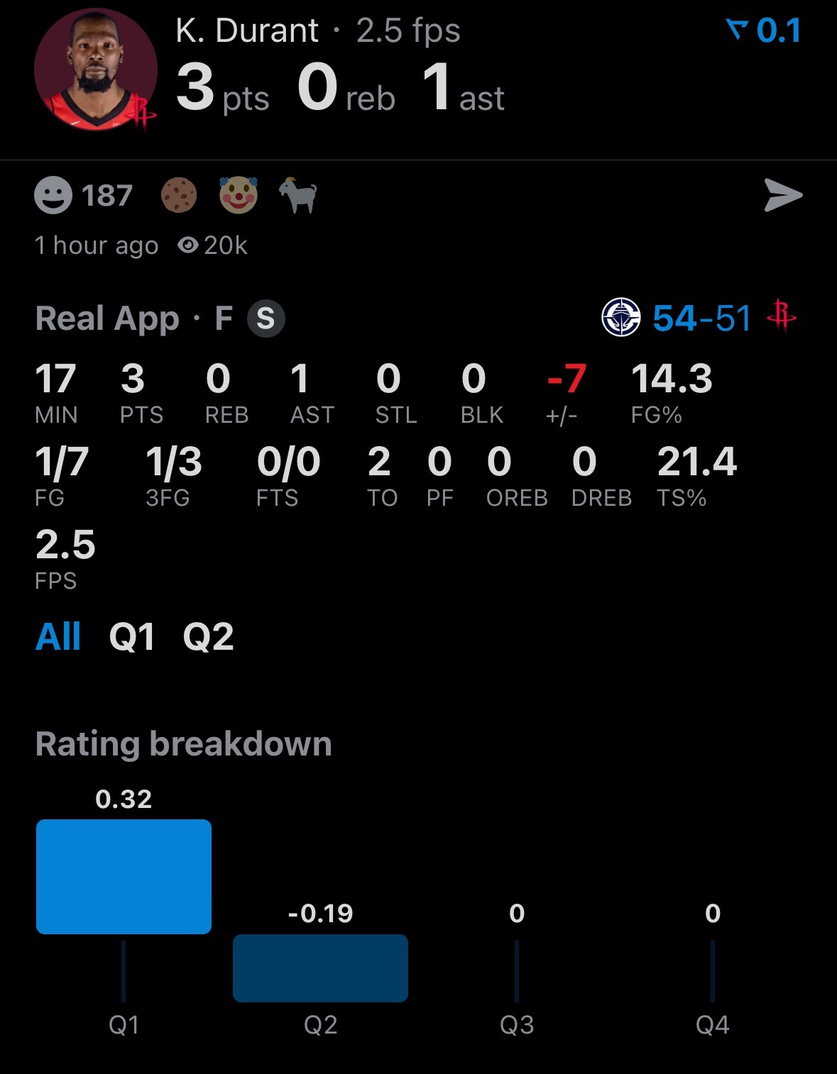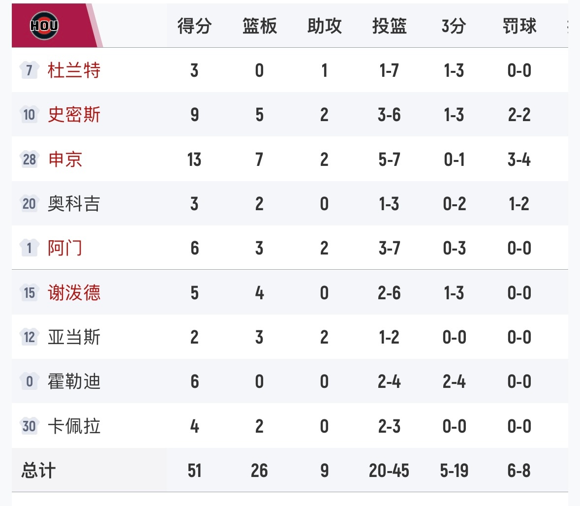 快船半场领先火箭3分。杜兰特7中1,得到3分1助攻2失误。快船能不能赢一把。快船