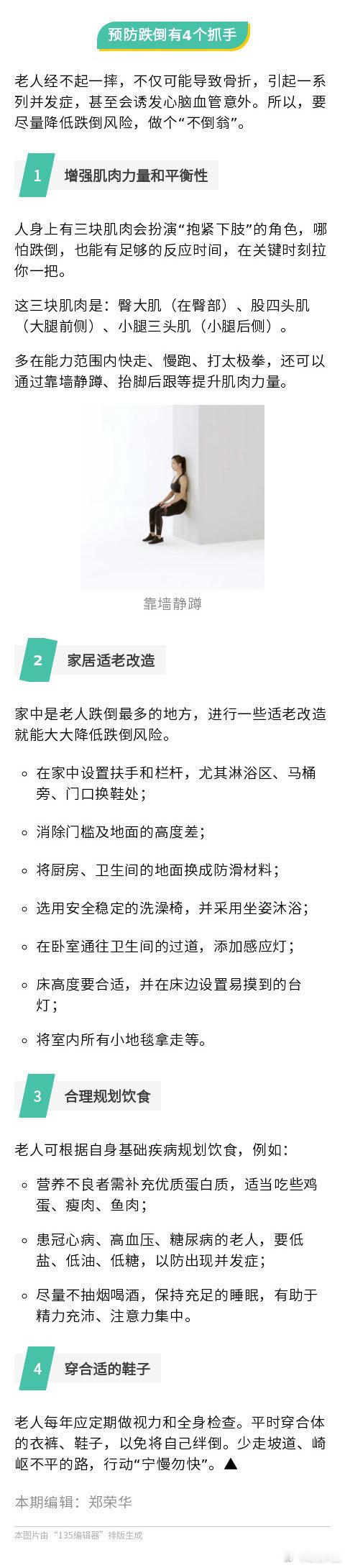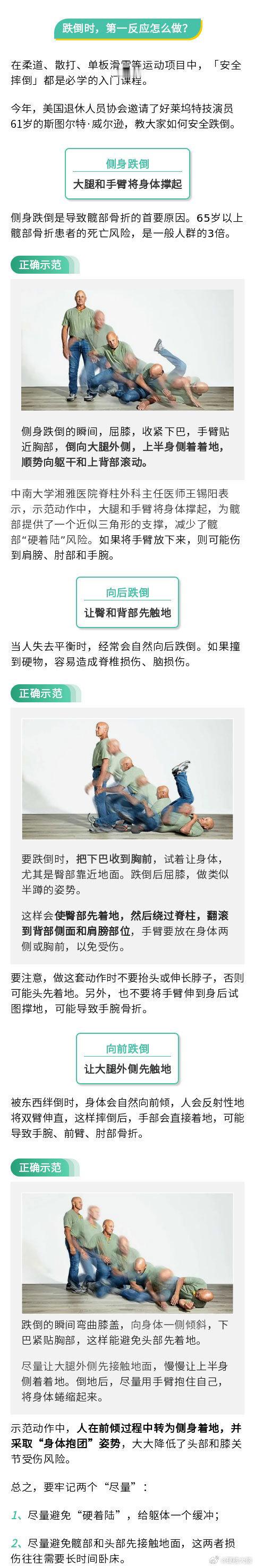 髋部骨折堪称人生最后一次骨折【摔倒时尽量让身体抱团 】跌倒时,身体向一侧、向前或向后倒去,哪个伤害大?老人摔倒后,总的原则是:不要贸然起身,先评估受伤情况,只有在没受伤的情况下、感到自己有足够力量时,才应考虑站起来。具体操作:◎从头部开始转动,自上而下,觉得累就休息一会,直到转为爬行姿势;◎手部缓慢发力,用膝盖撑地,爬向一个坚固的椅子或家具;◎不要着急,感觉累就休息一下;把手放在椅子上,一次一只手;◎用椅子支撑自己,小腿抬起垂直于地面,脚平放在地上,另一条腿保持跪姿;◎双臂和双腿发力,慢慢起身站立,转身;◎坐在椅子上,在做其他事之前,先坐下来喘几分钟气。如果受伤了,要冷静求助:休息片刻,找出身体受伤部位;使用紧急医疗警报设备,或给120或家人打电话求助。还可以抓起附近的东西,敲打地板或家具,以产生声响引起注意。(生命时报)
