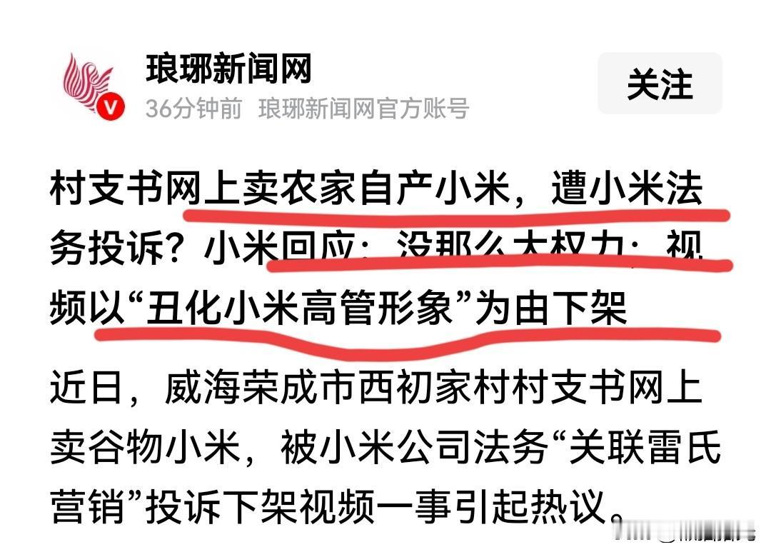 威海某村支书网上卖农家自产小米,遭小米法务投诉?引发热议 小米法务说下架这个村支书的视频不是因为他“卖谷物小米”,而是因为他“关联雷氏营销”… 我看了原视频,语言结构和风格上确实有一点点相似。 这个事件也提醒了大家,不要因为崇拜某人就去盲目模仿,小心别人的法务来找你!小米争议