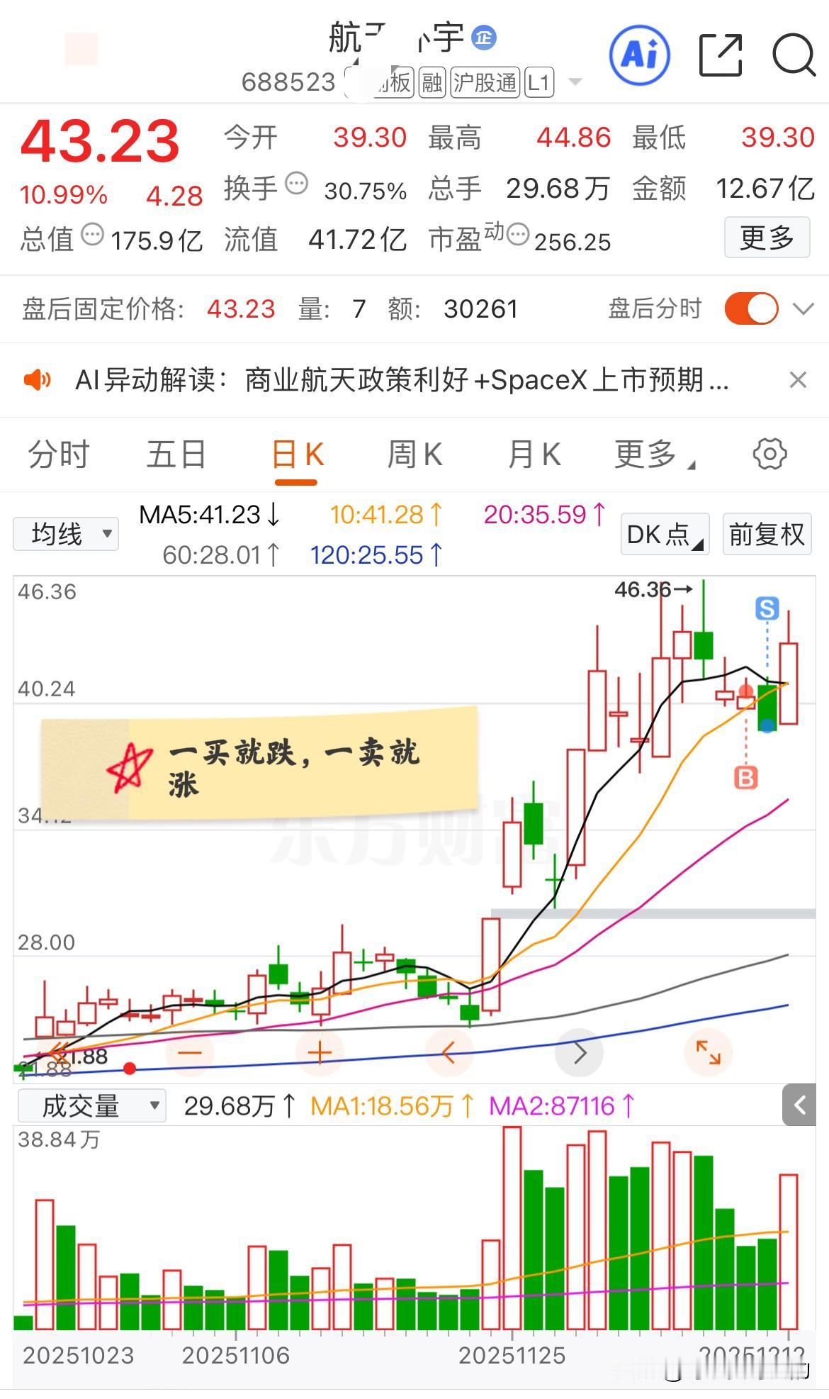 我真是纯韭菜啊[流泪]!哎,一买就跌,一卖就涨! 前天买的航天环宇,昨天尾盘在最低点割肉了,赔了3千。 结果今天盘中又一度大涨15个点,即使收盘也还有11个点的涨幅! 如果再坚持一天,今天至少能挣1万,结果被我这一操作,里外里1万3没了[流泪]! 真的是难受啊,哎,真的是太难了!