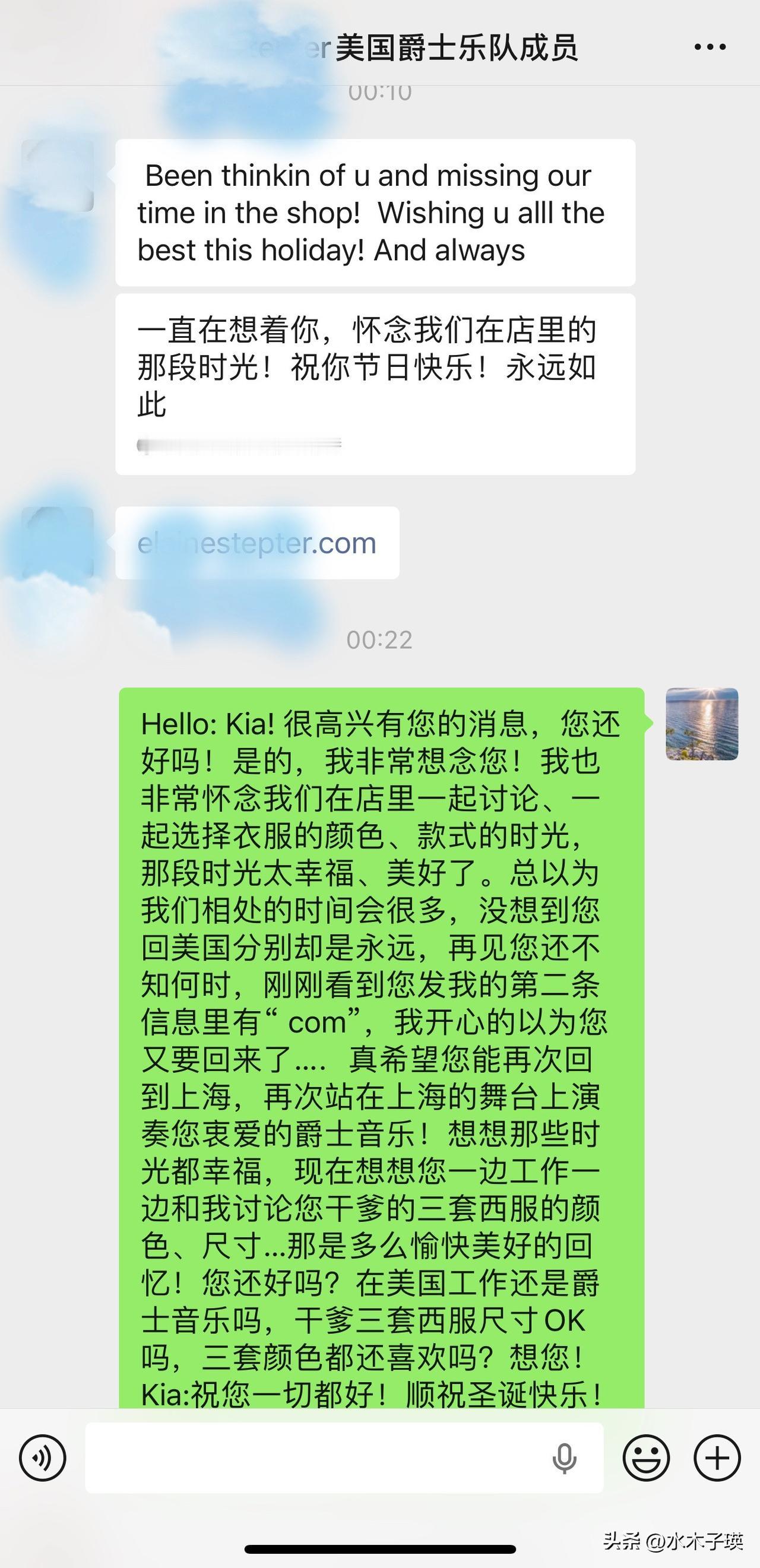 自从今年八月,Kia带着不舍和遗憾离开上海后,直到今晨12:00才收到Kia的消息。 Kia是美国人,在上海演奏爵士乐,她是靠自己的才华和能力在上海生活了六、七年。 本来计划也是今年8月回美国,休假一个月后即9月会回上海,没想到,7月的最后一两天,她突然沮丧的告诉我这次她回美国,可能不会再来上海了,她的领导告诉她可能被裁员了…. Kia因为每场演出都需要不同的服装,所以每年Kia都要在我这做服装,主要是她臀围比较大,稍胖,穿我做的衣服比较合适。 今年我们见面的次数比较多,因为她给她干爹定制了三套西服,每一套西服从选择颜色到选择款式我们俩都特别用心…. 今天凌晨突然收到了Kia的消息,真是太高兴了😊,就是那种久别重逢般的感觉。 想问她的话太多了。 祝Kia一切安好!