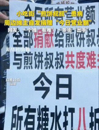 “暖遍全网!”福建师大旁小吃街的一幕看哭无数人,做煎饼十几年的“煎饼叔叔”突患重病,急需高额治疗费,本是“竞争对手”的周边摊主们,竟不约而同换上他的收款码,齐声说“今日营业额全捐,陪他共渡难关”,这份烟火气里的守望相助,感动了新华社、中国青年报,也暖透了全网的心!网友:“这才是真正的远亲不如近邻!” 据媒体报道,这感人的故事发生在福州闽侯县的小吃街,50岁的煎饼摊主张建武,是学生和街坊们都熟悉的“老熟人”。他做的煎饼分量足、酱料香,为人还热情,学生们下课后总爱围在他的小摊前,一句“叔叔,多放生菜”就能换来满溢的实惠。可谁也没想到,11月还在出摊的他,12月就因肾癌晚期伴转移停了业,全家唯一的经济来源突然断了,上有年迈父母、下有两个读书的孩子,50万治疗费让这个普通家庭犯了难 。 无奈之下,家人在网上发起求助,消息很快传到了小吃街的摊主群里。“都是摆摊的,起早贪黑的苦谁不懂,能帮一点是一点!”生煎摊主高先生第一时间提议义卖,没想到一呼百应,馄饨铺、糖水铺、芋泥饼铺的老板们纷纷点头,第二天一早就把自家收款码换成了煎饼叔叔的,还贴出醒目的通知:“捐赠今日营业额,与煎饼叔叔共渡难关”。 摊主们不光捐营业额,还主动打折促销,有的送小食、有的加量不加价,就想让更多人来支持这场爱心接力。学生们得知消息后,更是排起了长长的队伍,有人专门从其他校区赶来,有人付款时悄悄加价,还有人直接扫码捐助,嘴里说着“东西不重要,就想帮叔叔一把” 。往常要卖到深夜的备货,不到两小时就售空了,摊主们忙着打包、收款,脸上满是真诚的笑意,没有一丝怨言。 更让人动容的是,还有外地网友特意跨城赶来消费支持,曾受过他人帮助的摊主姐妹,也带着父亲一起来义卖:“自己曾被撑伞,现在也想为别人遮雨” 。煎饼叔叔的妻子龚女士在电话里多次哽咽,看着不断到账的善款,她一遍遍说着“谢谢”:“没想到这么多陌生人帮我们,这些好意,我们一家人一辈子都记在心里”。截至目前,水滴筹加上摊主、网友的捐款,已近17万元,为这个困境中的家庭送去了希望。 这事在网络上刷屏后,网友们纷纷留言点赞:“烟火气里的人情味,最是治愈人心”“平时是竞争对手,危难时是一家人,这才是中国好邻居”;还有人说“我也是摆摊的,知道起早贪黑的不易,摊主们的行动太暖心了,为他们骄傲”。 我想,不止煎饼叔叔会被这份善意打动,我们每个人看到这样的故事,心里都会暖暖的。生活里总有风雨,可总有这样一群普通人,用微不足道的行动汇聚成暖流。他们没有惊天动地的壮举,却在别人需要时,毫不犹豫地敞开胸怀,用营业额、用排队的身影、用一句句鼓励,告诉我们“你不是一个人在战斗”。 煎饼叔叔的炉火暂时熄灭了,但无数人心里的暖灯被点亮了 。摊主们的一声“我帮你”,学生们的一句“我支持”,双向的善意让这个寒冬不再寒冷。每次看到这样的守望相助,都让人觉得无比踏实,原来在我们身边,总有不期而遇的温暖,总有生生不息的希望。 最后,给这条小吃街的摊主们点赞,给所有传递善意的人点赞!愿这份烟火气里的情义能一直延续,也愿煎饼叔叔能早日战胜病魔,重新燃起煎饼摊的炉火,把这份温暖继续传递下去!